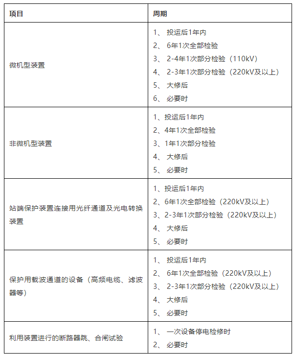 ★备注:全部检验、部分检验的区别在于检验项目多与少、检验周期长与短上的不同。制定部分检验周期计划时,运维部门可根据保护装置的电压等级、运行工况、运行环境与条件,适当缩短检验周期,并有目的、重点选择检验项目。