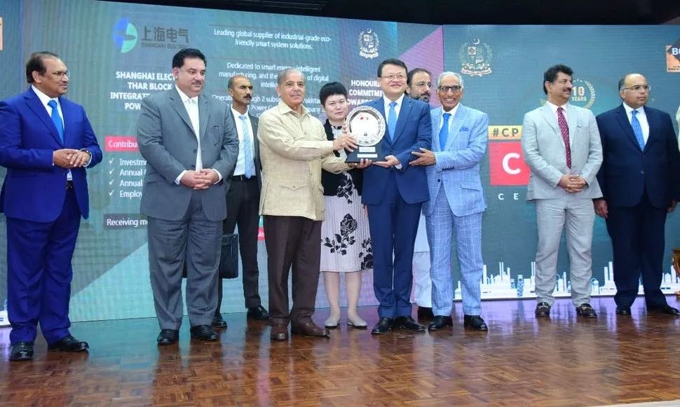 在“中巴经济走廊”启动十周年之际,巴基斯坦总理办公室投资委员会于当地时间8月7日,在首都伊斯兰堡举行“共同繁荣的贡献者”表彰仪式。会上,巴基斯坦总理夏巴兹·谢里夫为上海电气等29家中资企业机构亲自颁发“杰出贡献奖”奖牌,以表彰上海电气成功推进塔尔煤田一区块能源一体化项目做出的努力和贡献。项目建成后,有望在未来30年运营中为巴基斯坦400万户家庭提供清洁、廉价、可持续的电力,帮助巴基斯坦开进一步发本土资源,减少能源进口,改善能源结构,增强国家能源安全。据了解,该项目于2014年起开发,于2023年2月完成投运,在建设推进过程中,上海电气充分履行企业社会责任,积极培养当地人才,受到广泛好评