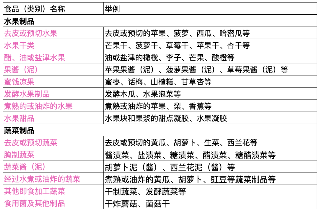 (1)果蔬类:如去皮或预切的新鲜水果和蔬菜:凉拌黄瓜、蔬菜水果沙拉等(需要与餐饮服务食品区分);