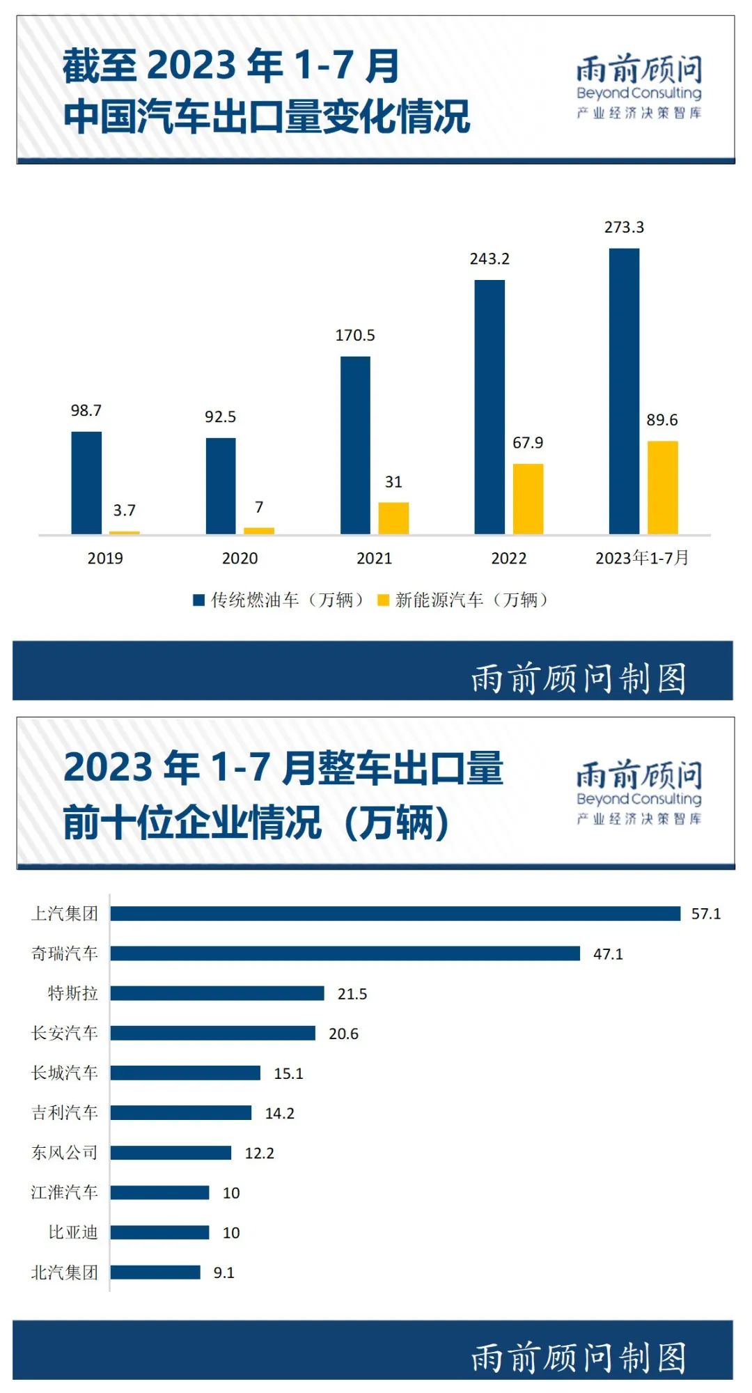 海关总署数据显示,2023年上半年,中国汽车出口量达234.1万辆,同比增长76.9%,其中新能源汽车出口79.5万辆,同比增长1.2倍,而同一时期的日本汽车出口量为202万辆。7月份,汽车出口继续创新高,整车出口量达39.2万辆,同比增长35.1%,其中新能源汽车出口10.1万辆,同比增长87%。