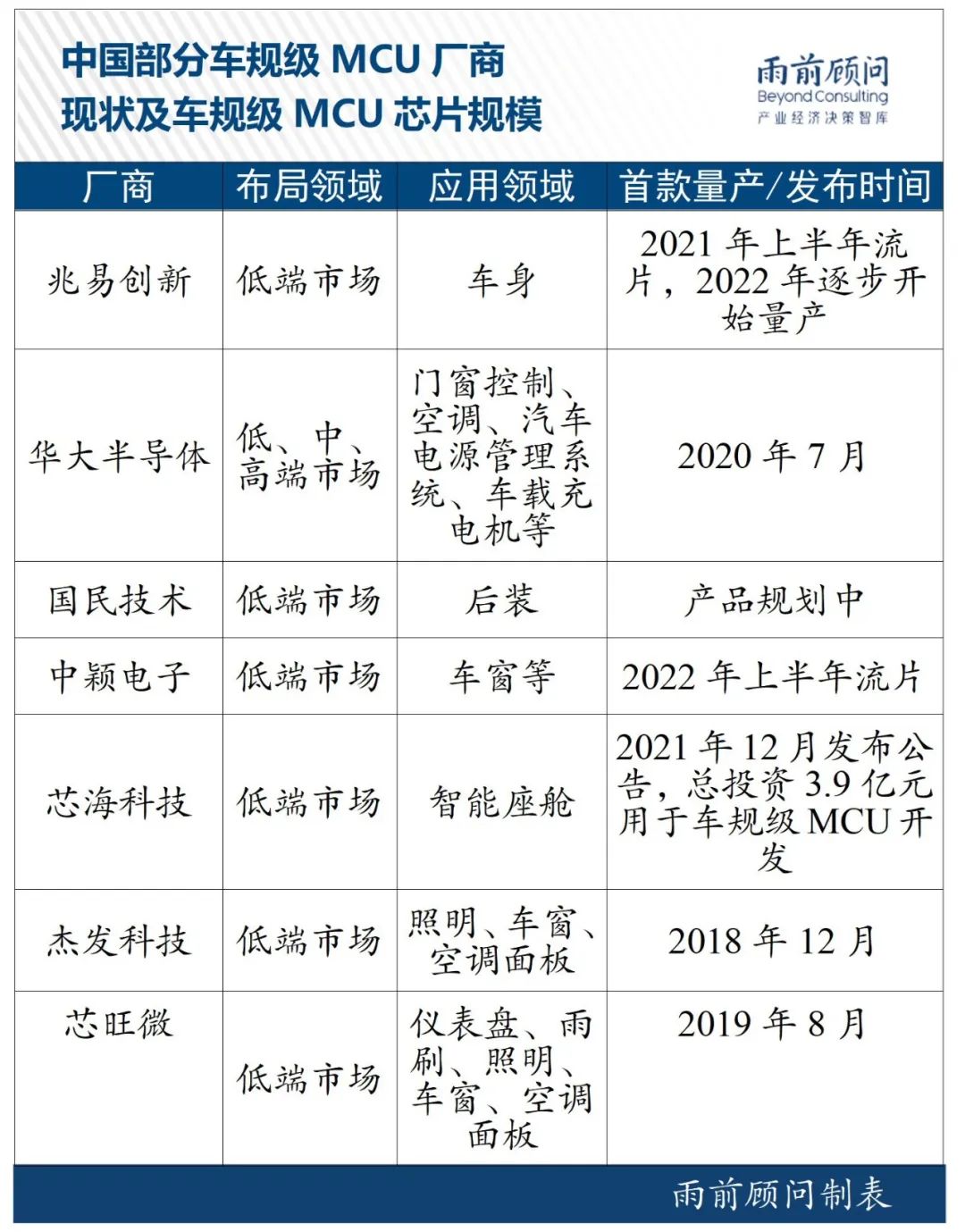 全球车规级MCU市场主要被美国德州仪器、恩智浦、意法半导体等跨国公司垄断,国内厂商仅占不到5%的市场份额。近年来,国内部分厂商逐步从雨刷、遥控器等安全性能较低的中低端车规级MCU入手,着手研发智能座舱、ADAS等未来汽车智能化所需的高端MCU。现阶段,兆易创新、芯海科技、华大半导体等厂商均有通过车规验证的产品,随着生产技术和工艺的持续优化,持续推动国产化进程。