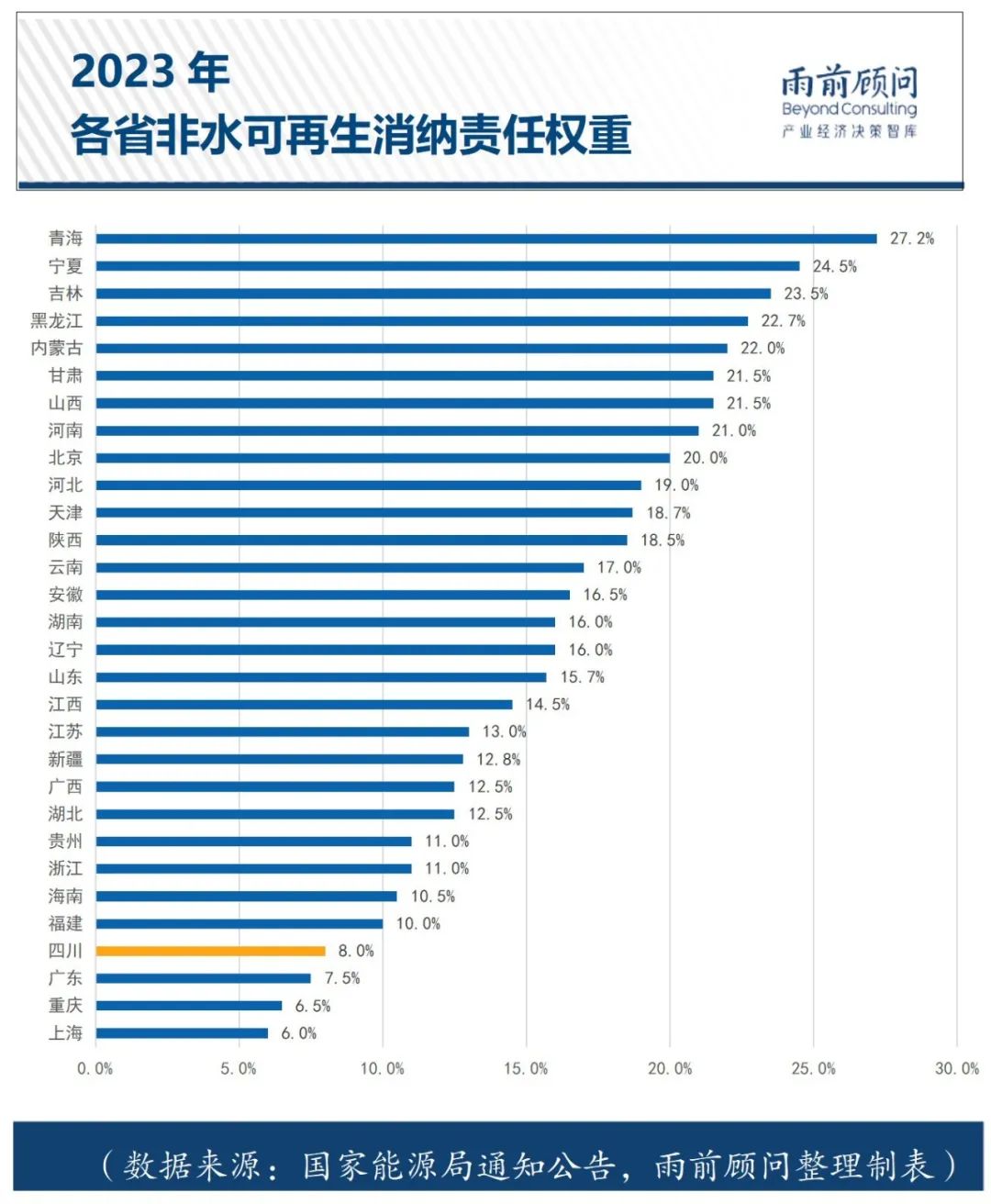 从具体责任权重来看,云南、四川、青海三省的可再生能源消纳权重超过70%,显示出这些地区在可再生能源消纳方面的领先地位。特别是青海,其非水可再生权重最大,达到27.2%。而四川非水可再生能源消纳权重仅占8%,2024年预计9.7%,能源结构仍将以水电为主,逐步提升风电、光伏等非水可再生能源的多能互补程度。
