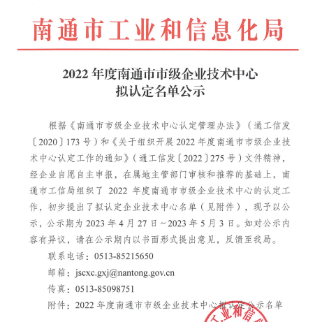 南通市工业和信息化局发布了《2022年度南通市市级企业技术中心拟认定名单公示》,恒劢安防荣获“南通市市级企业技术中心”认定。此次入选是对恒劢安防在创新效益、技术积累、竞争优势、营收规模、研发投入、知识产权等多方面创新发展成果的认可,也是恒劢安防继江苏省“专精特新”中小企业之后获得的又一项重要认定。