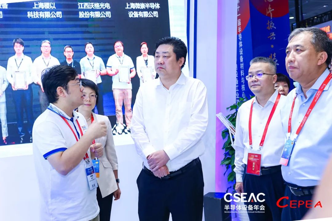 微崇半导体开发的创新领先的前道量检测技术引来与会嘉宾的极大关注。无锡市委副书记、市长赵建军,北方华创董事长、中国集成电路装备创新联盟理事长赵晋荣来到微崇半导体展厅了解半导体量检测设备产业及微崇自身发展情况。