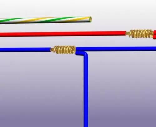 下面是第二种接法(防火胶布隔离法),多用于吊项内,或比较高能的工程中,主线不能能弄断,符线绕主线6--8周,吊顶内的射灯,一路上要有很多灯就是这样接法,用防火胶布缠在里面,它的作用就是防止电打火烧坏东西,这是在吊顶内很重要。外面再用绝缘胶布缠绕。
