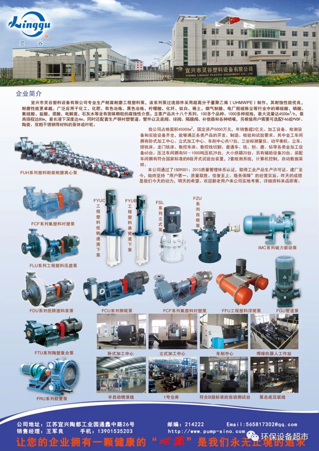 宜兴市灵谷塑料设备有限公司专业生产耐腐耐磨工程塑料泵,该系列泵过流部件采用超高分子量聚乙烯(UHMWPE)制作,其耐蚀性能优良,耐磨性能更卓越。广泛应用于化工、化肥、有色冶炼、黑色冶炼、柠檬酸、化纤、钛白、稀土、烟气制酸、电厂脱硫除尘等行业中的稀硫酸、磷酸、 氟硅酸、盐酸、混酸、电解液、石灰水等含有固体颗粒的腐蚀性介质。主要产品共十八个系列、100多个品种、1000多种规格,最大流量达4500m³/h,最高扬程达80m,最长液下深度达4m。同时还配套生产钢村塑管道、管件以及底阀、球阀、隔膜阀、补偿器和各种喷嘴,另根据用户需要可选配F46或PVDF、 陶瓷、双相不锈钢等材料的泵体或叶轮。
