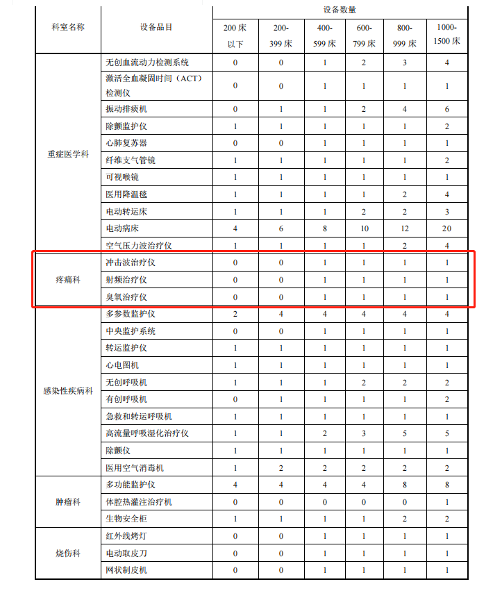 根据最新的《县级综合医院设备配置标准》要求,400张以上床位的县级综合医院疼痛科需要配备臭氧治疗仪、射频治疗仪、冲击波治疗仪。该标准将于2024年1月1日开始执行。