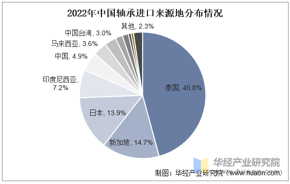 我国轴承主要进口来源地为泰国,2022年进口数量达9.58亿套,占比45.8%。