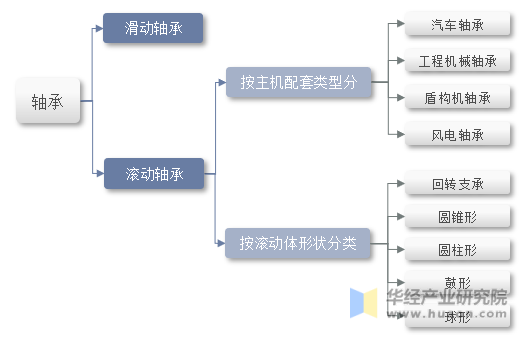轴承是机械设备中的一种基础部件,主要功能是支撑机械旋转体、降低机械旋转体运行过程中的摩擦系数、保证机械旋转体的回转精度,被誉为“工业关节”。轴承产品规格型号较多,按主机配套类型分可分为风电轴承、工程机械轴承、汽车轴承、机床轴承、铁路轴承、冶金矿山机械轴承等;根据轴承工作时承受的载荷方向,分为主要承受径向载荷的向心轴承和主要承受轴向载荷的推力轴承;根据轴承工作时运转的轴与轴承座之间的摩擦性质,可分为滑动轴承和滚动轴承两大类,其中滚动轴承是轴承工业的主要产品,通常所说的轴承,一般指滚动轴承。