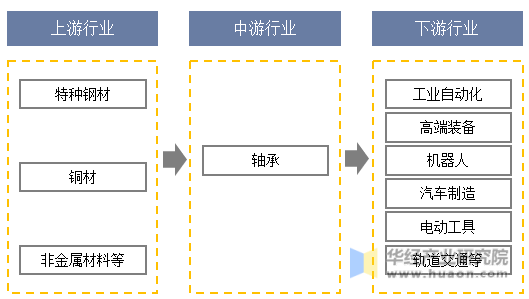 轴承行业上游企业主要包括特种钢材、铜材、非金属材料等供应商,下游广泛应用于工业自动化、高端装备、机器人、汽车制造、工程机械、家用电器、电动工具、纺机、农林机械、国防、能源、航空航天及轨道交通等领域。