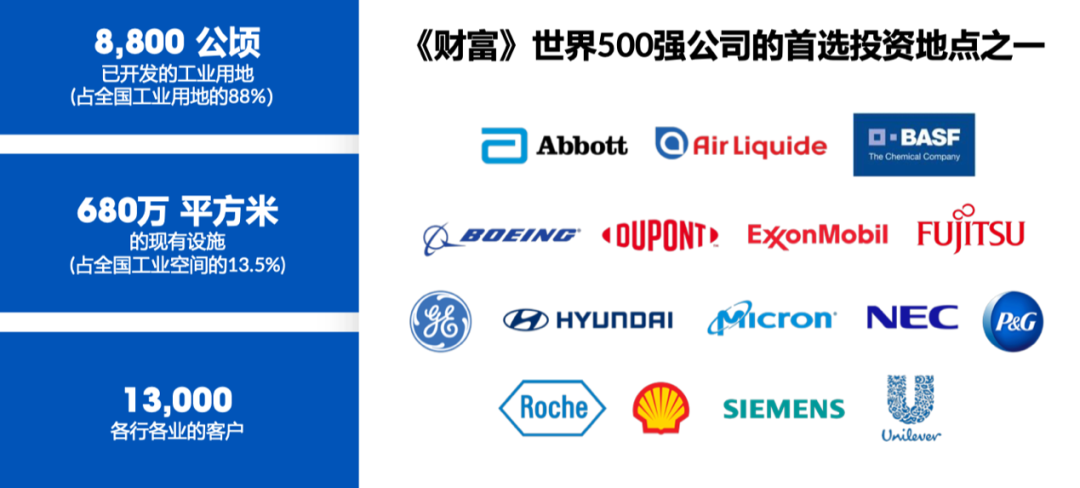 截止最新数据,JTC已开发的工业用地8800公顷,占新加坡全国总工业用地的88%。现有空间设施680万平方米。目前JTC园区覆盖和合作的客户总量超过1.3万家,包括各行各业的龙头企业。
