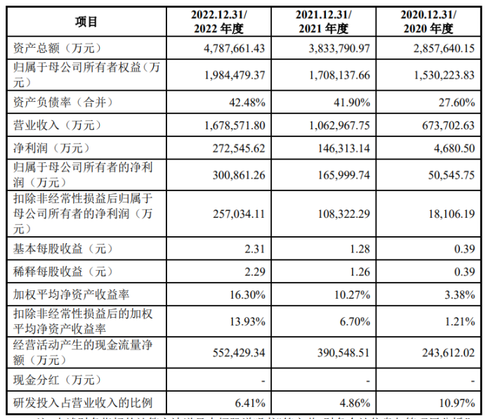 2020-2022年12月公司营业收入分别为67.37亿元、106.29亿元、167.85亿元,归属于母公司所有者的净利润分别为4680万元、14.63亿元、27.25亿元。