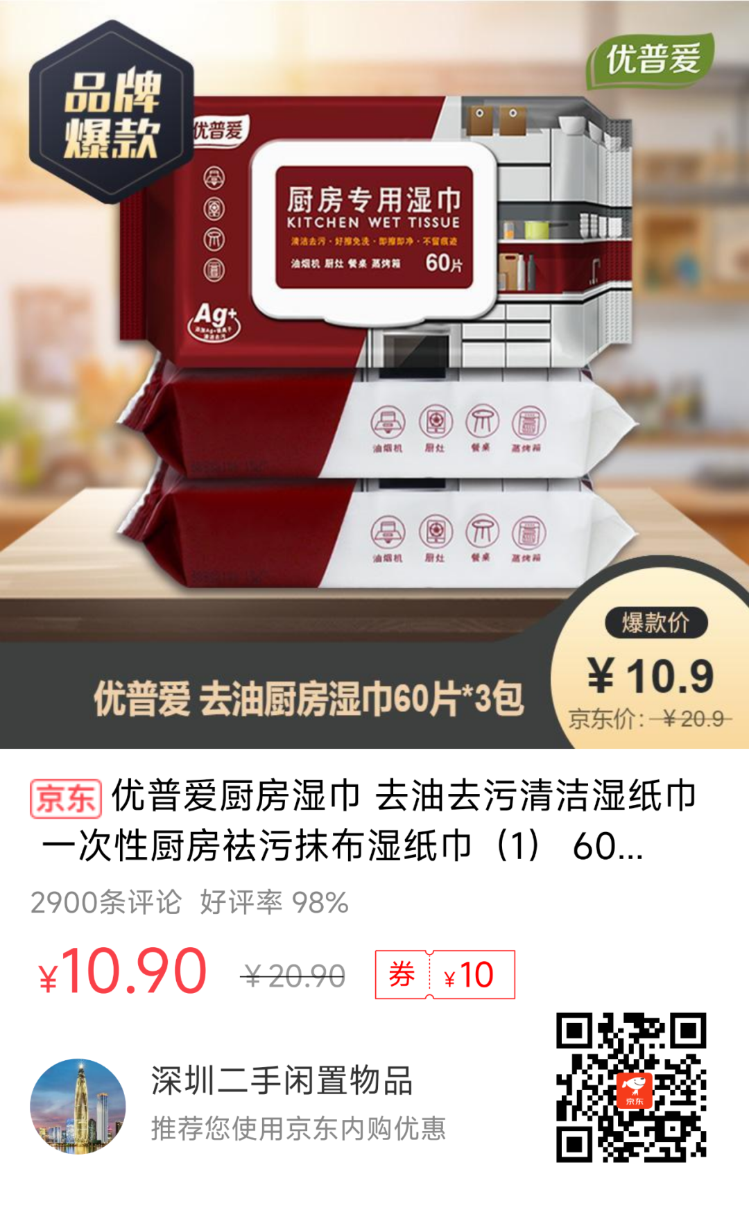 4、【京东】优普爱 去油厨房湿巾60片*3包--10.9元