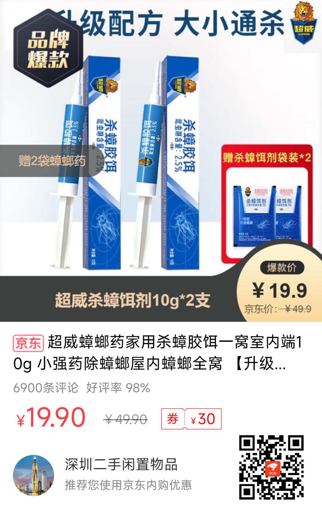 8、【京东】超威杀蟑饵剂10g*2支+赠--19.9元