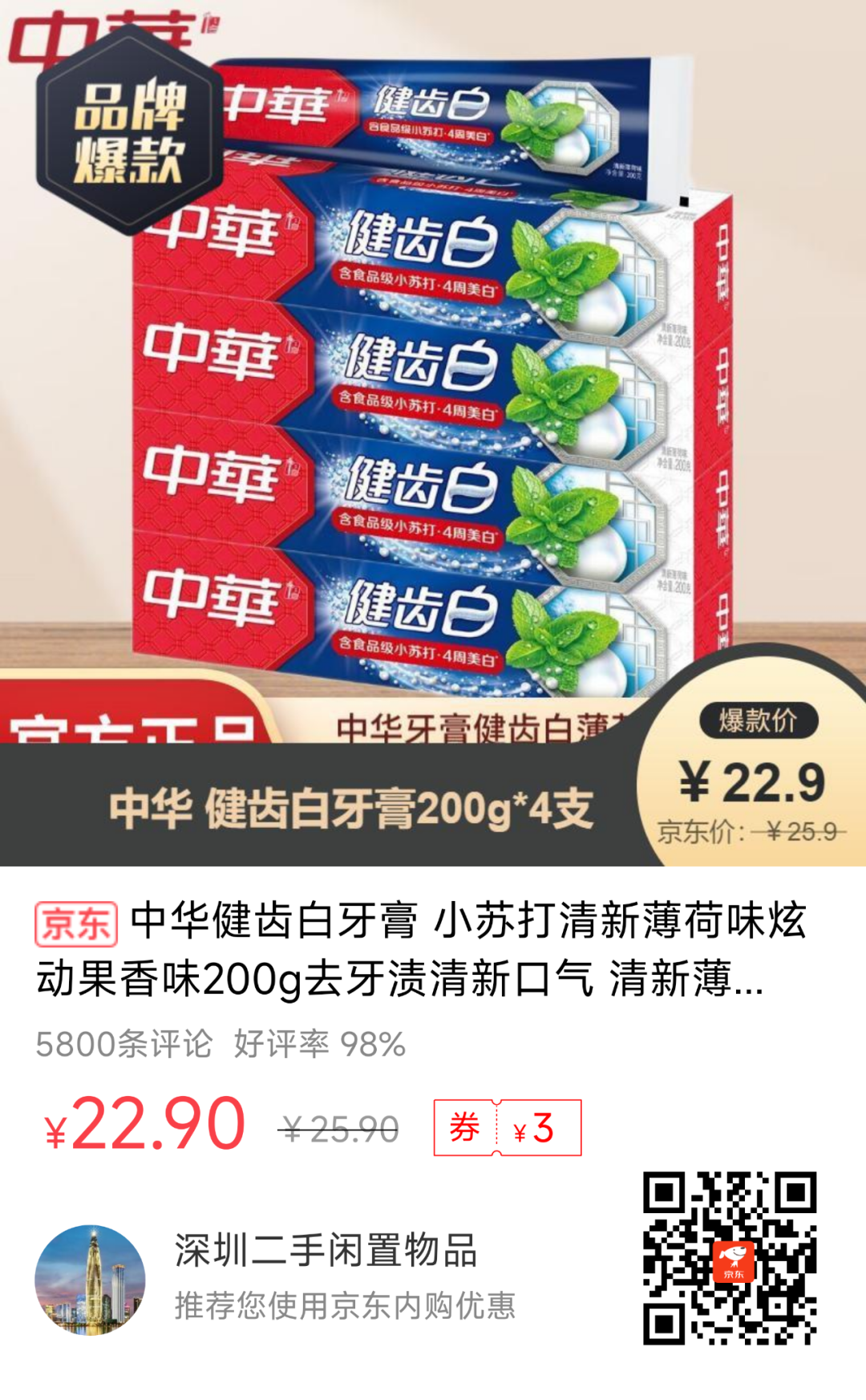 6、【京东】中华 健齿白牙膏200g*4支--22.9元