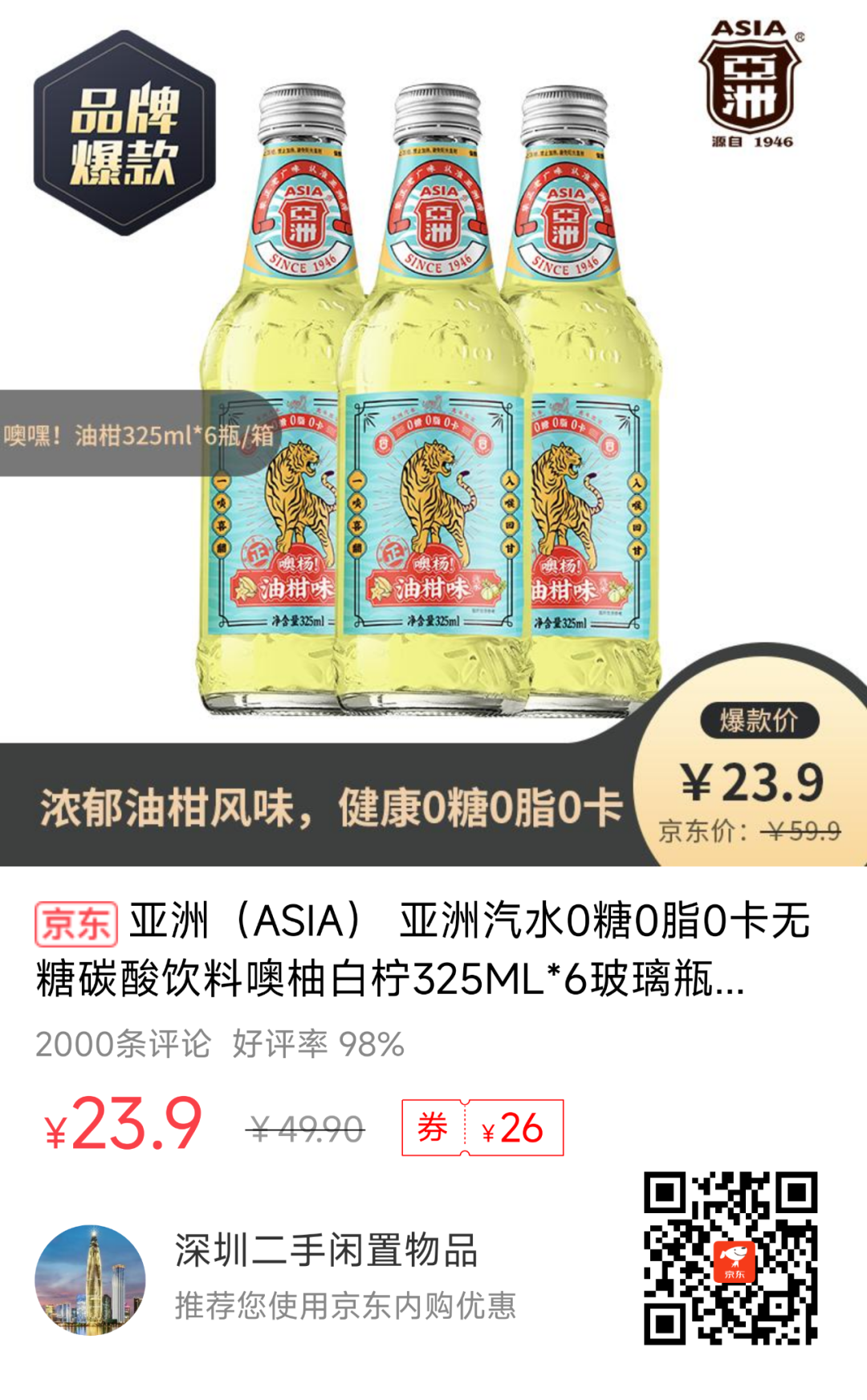2、【京东】亚洲无糖碳酸饮料油柑 325ML*6瓶--23.9元