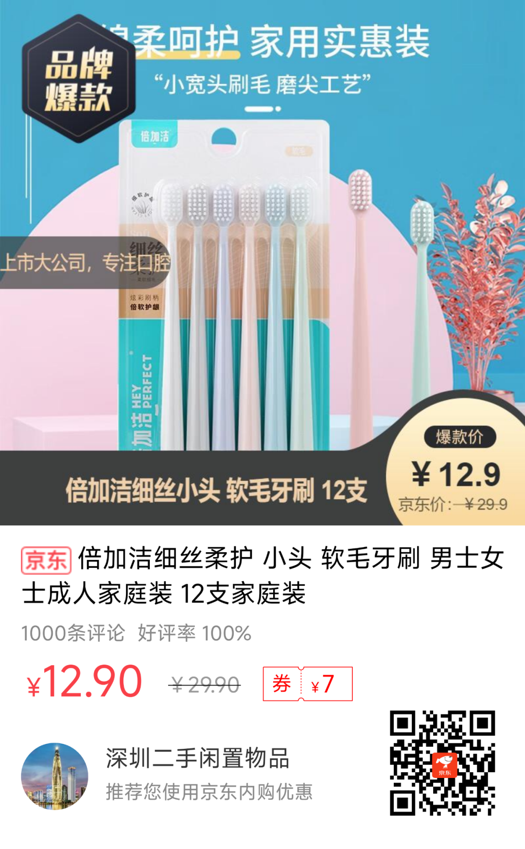 5、【京东】倍加洁细丝柔护小头 软毛牙刷 12支--12.9元