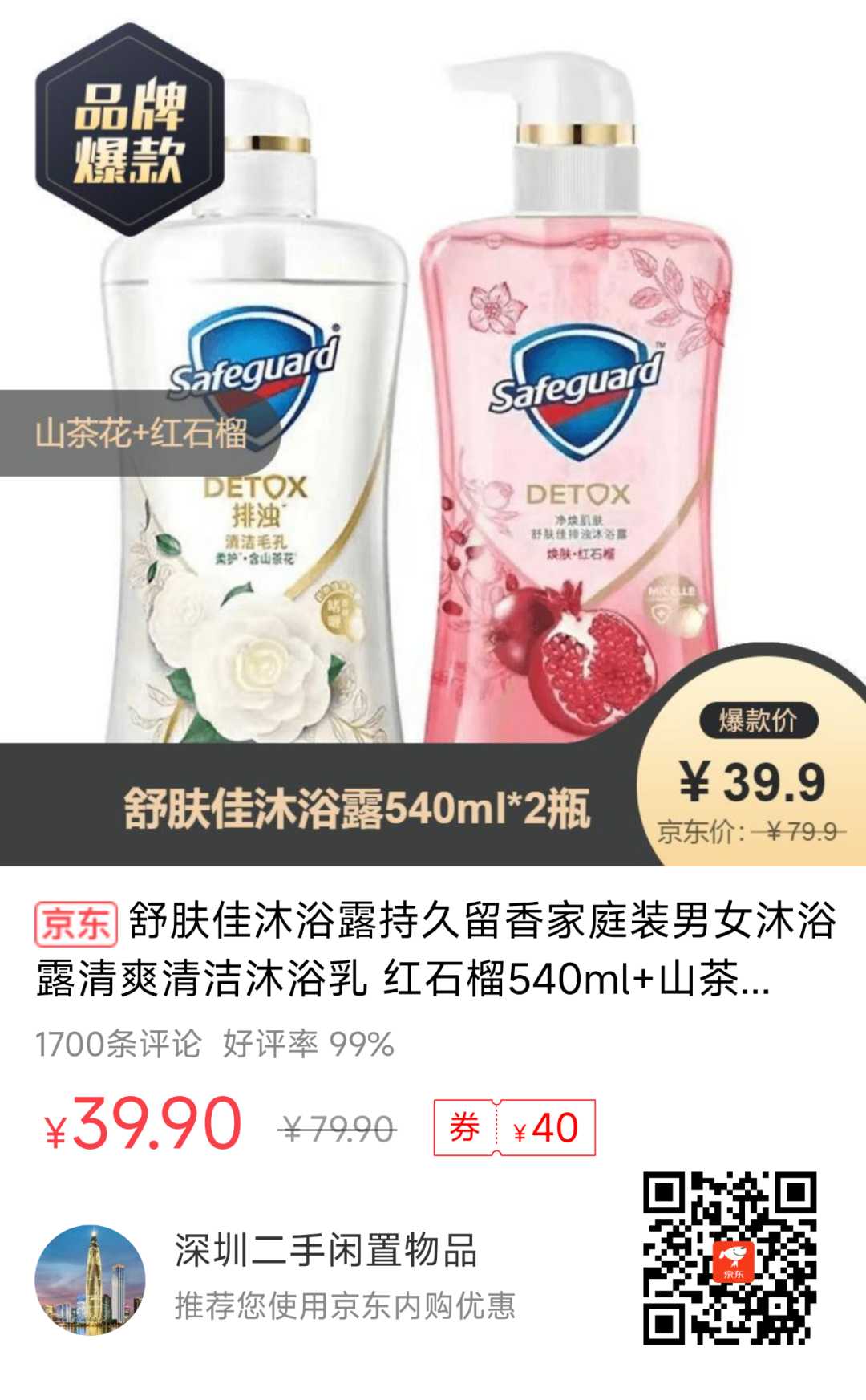 3、【京东】舒肤佳沐浴露540ml*2瓶--39.9元