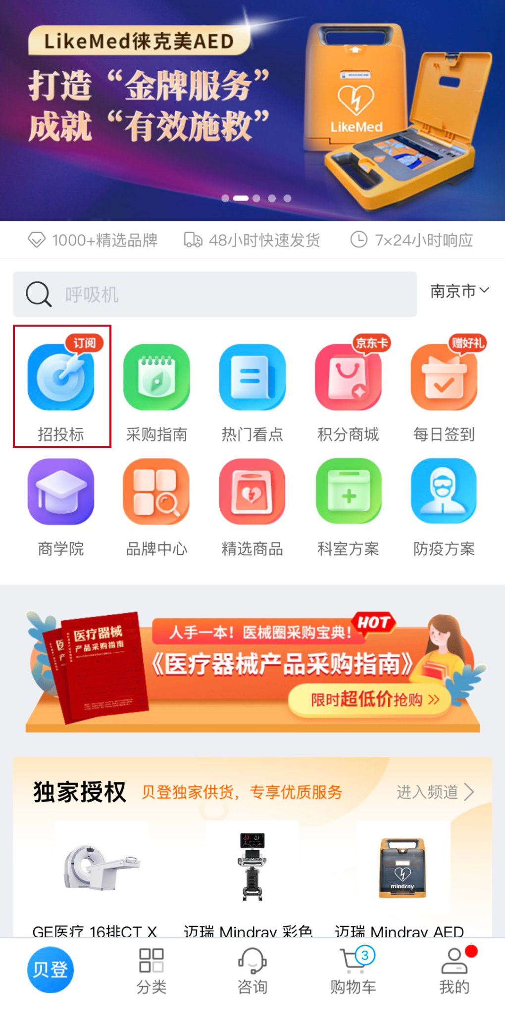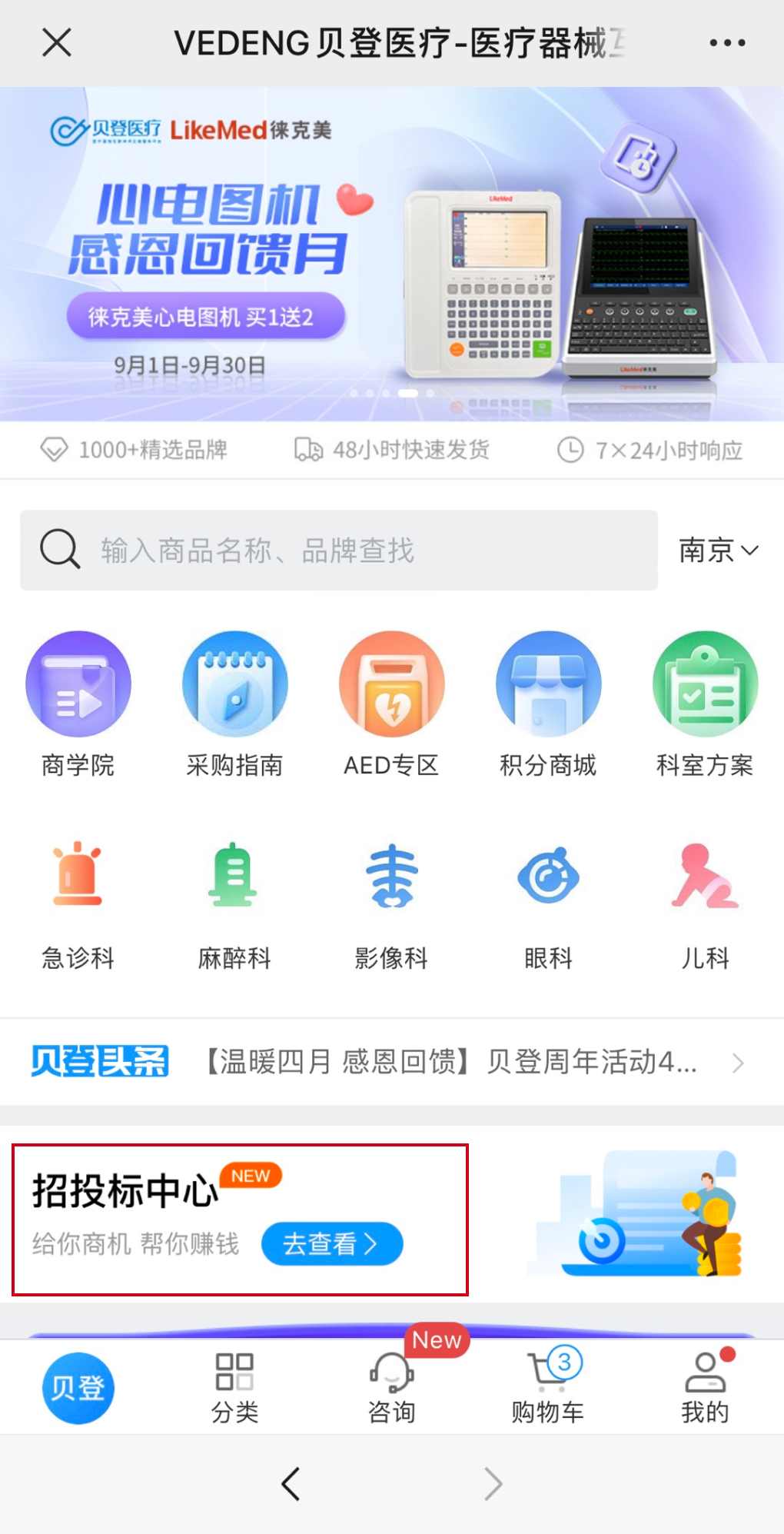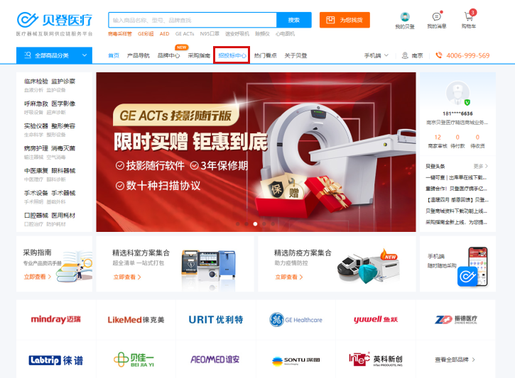 2、贝登医疗微信公众号:进入贝登商城首页点击“招投标中心”进入