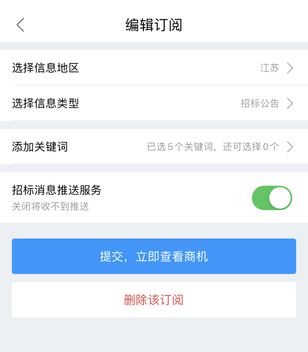 除了免费查询外,贝登招投标中心支持根据自己的偏好进行订阅设置,例如,可选择信息地区、信息类型(招标公告、招标预告、招标变更、招标结果)以及信息关键字,设置好后,打开推送开关,即可随时获取关注的信息推送。