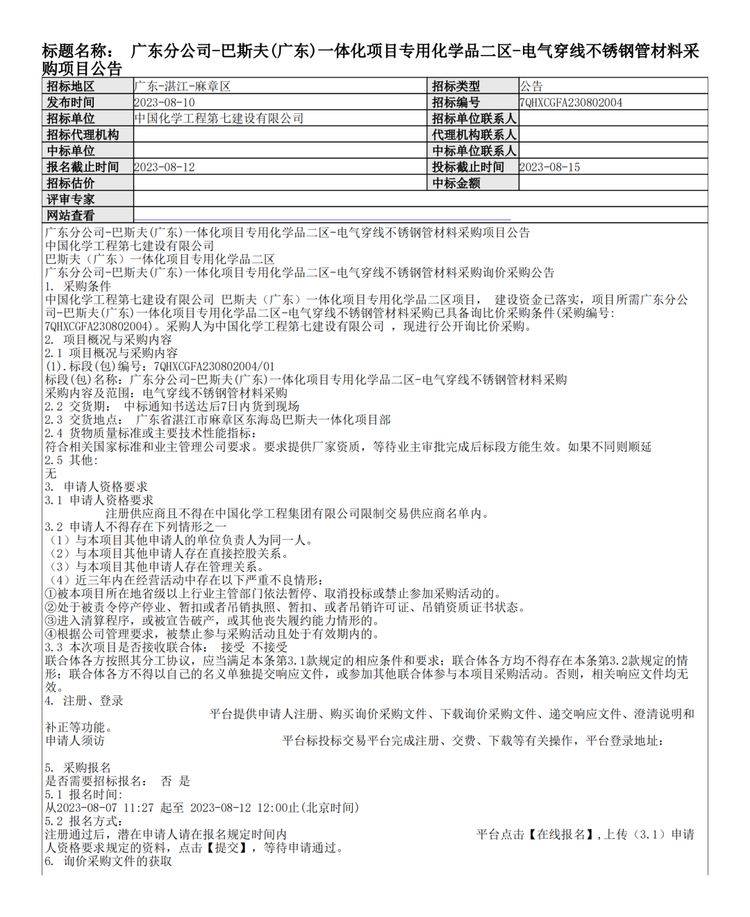 巴斯夫(广东)一体化项目电气穿线不锈钢管材料采购公告