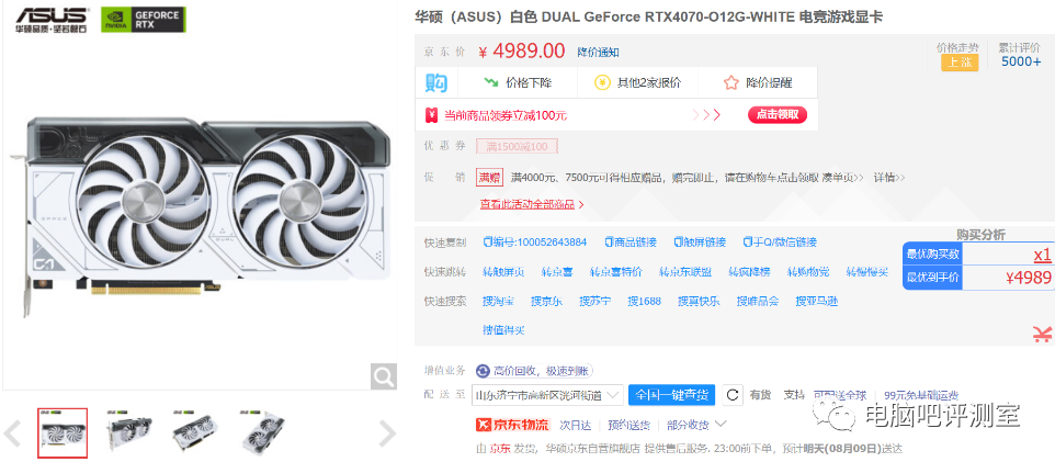 首先显卡我推荐这款,如果我自己买的话,也大概率会买这款。雪豹白色的外观首先不用多说,其次双风扇2.5槽位的占用让它可以胜任大多数机箱。唯一的缺点就是,4070可能满足不了4K的需求,毕竟说到底,4070也就是3080的水平,应付目前已经普及开的4K高刷可能有点吃力了。做工的话,ASUS是不用担心的,单8pin接口功耗也不高,纯白装机的理想选择之一。