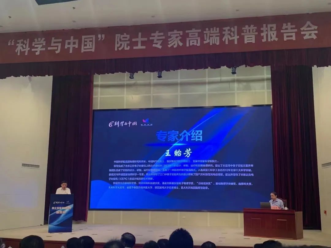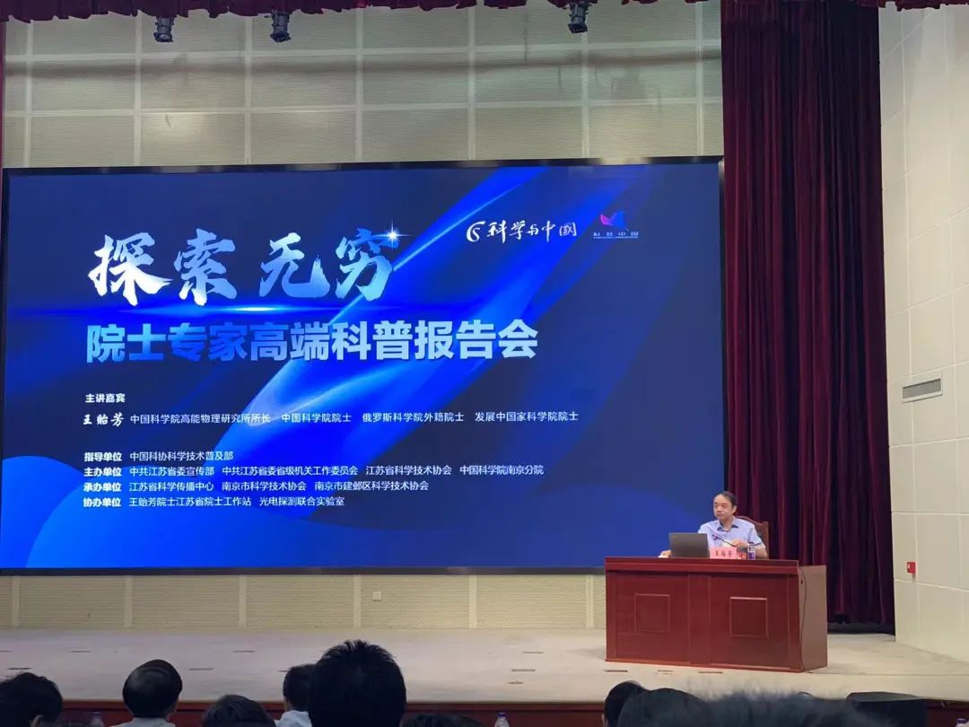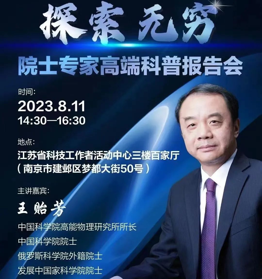 2023年8月11日下午,由江苏省委宣传部、江苏省科学技术协会等单位主办,“科学与中国”院士专家高端科普报告会在江苏省科技工作者活动中心举行,中国科学院高能物理研究所所长、中国科学院院士王贻芳以“探索无穷——从追赶到领先”为题,为观众奉上了一场宇宙探索之旅。