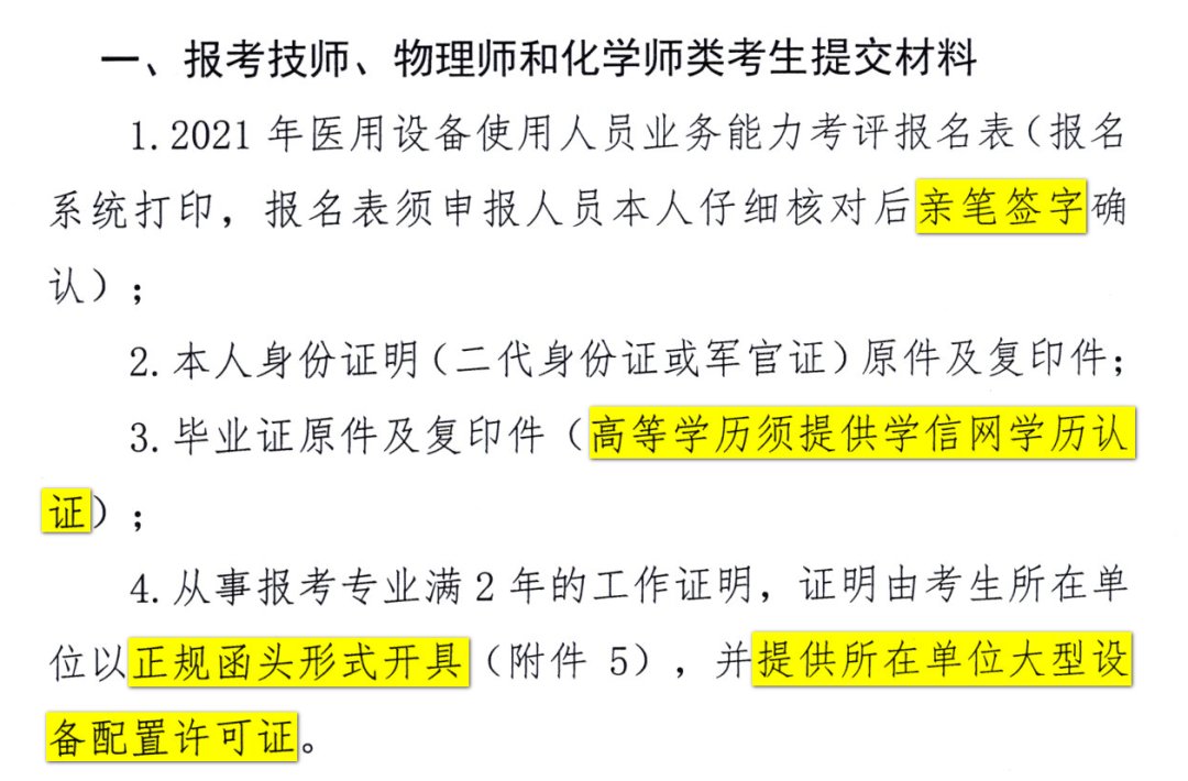 1.《2021年医用设备使用人员业务能力考评报名表》(考生本人报名后自行下载打印),需个人签名及单位人事部门签字盖章;