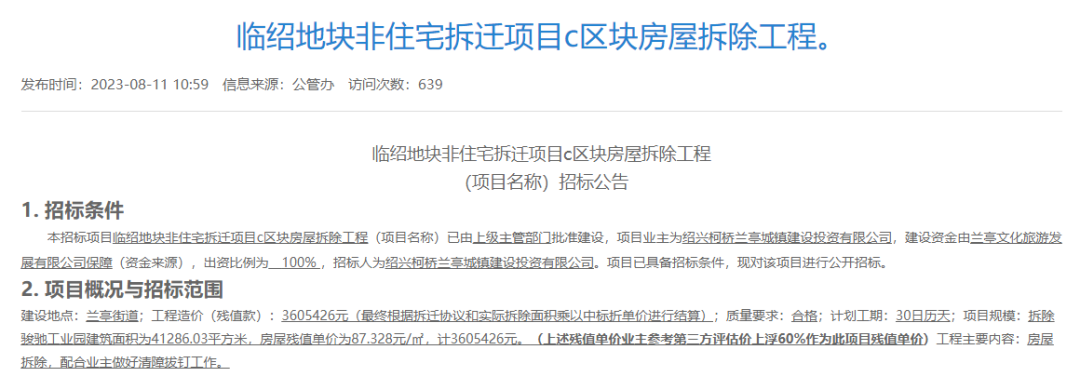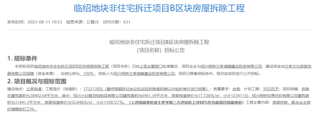 8月11日,绍兴市柯桥区公共资源交易中心发布了两则房屋拆除工程招标公告。