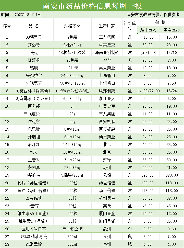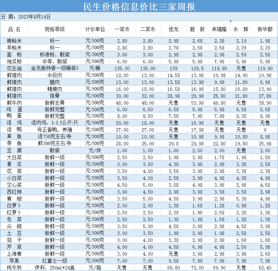 物价表每周更新!