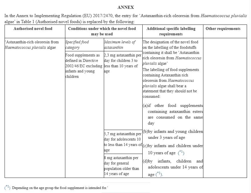 2023年8月2日,欧盟委员会发布法规(EU)2023/1581,根据欧洲议会和理事会法规(EU)2015/2283,就来自雨生红球藻(Haematococcus pluvialis algae)的新型食品富含虾青素油树脂(astaxanthin-rich oleoresin)的使用条件修订(EU)2017/2470实施细则附件。本法规在欧盟官方公报公布后20天生效。具体修订内容如下: