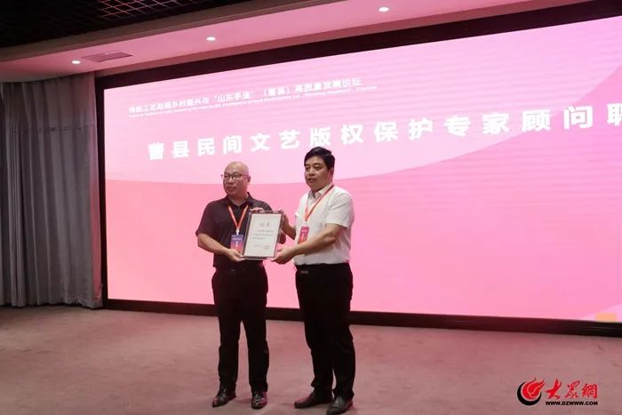 会上,还进行了曹县重点手造项目签约仪式;聘任山东省区域文化产业研究院院长孙吉国为曹县民间文艺版权保护专家顾问;最后,各相关领域专家学者分别作了主题演讲。
