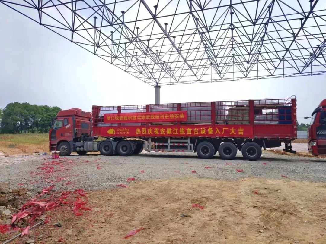 在全场瞩目下,安徽江锐智能设备有限公司首台设备正式入厂,现场礼花纷飞,鞭炮齐鸣。