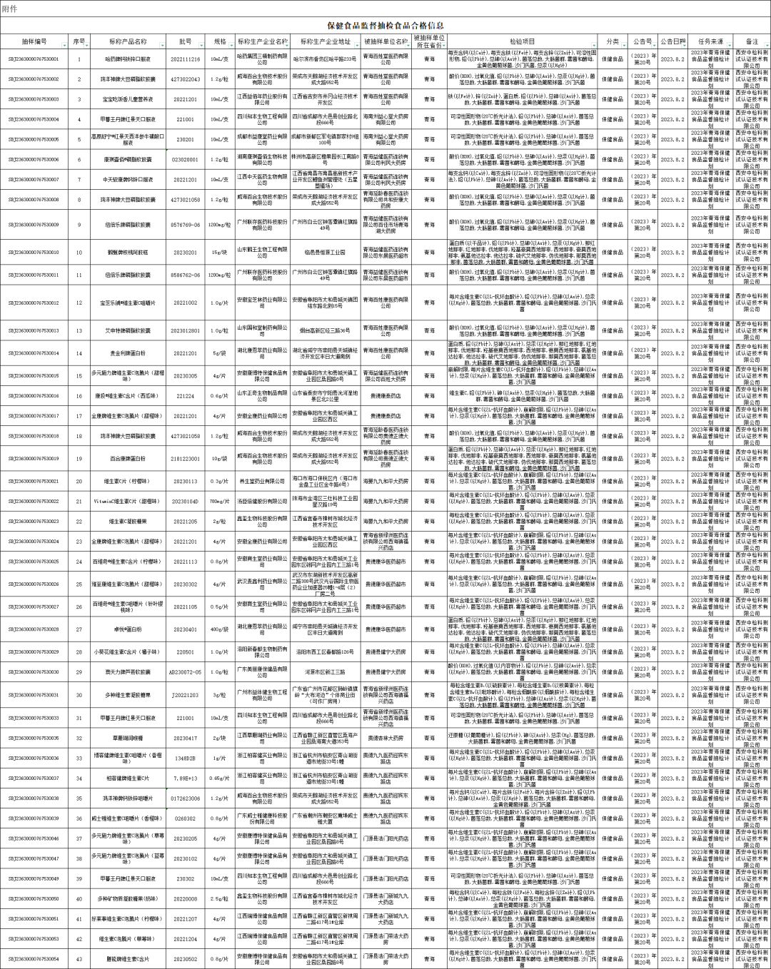 近期,省市场监管局在组织开展的2023年青海省保健食品安全监督抽检任务中,抽检了43批次保健食品,经检验全部合格。