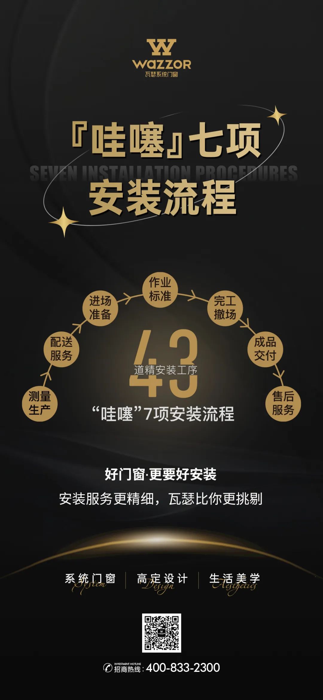 瓦瑟作为行业的高定品牌,始终专注产品质量与客户服务,为了给用户打造提供更好的使用体验,在诸多项目的实践中总结经验,引进德国伍尔特专业安装服务标准,不断升级和完善安装标准,最终推出“哇噻到家”精装交付系统,7项安装流程,43道安装工序,专业化、标准化、流程化,严格把控安装的每个细节,打造专属“哇噻”七星服务标准。以匠心成就极致安装交付体验,让用户舒享高质量家居生活空间。