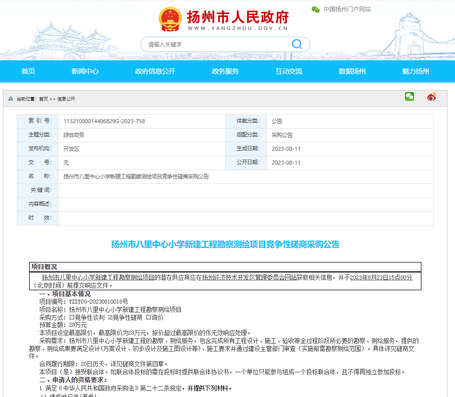 扬州市八里中心小学新建工程勘察测绘项目竞争性磋商采购公告