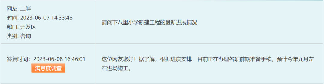 今年6月,有网友在市长信箱咨询八里小学新建工程的进展情况。