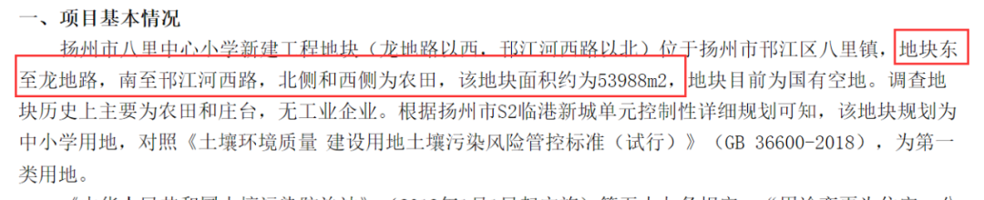八里中心小学新建工程东至龙地路,南至邗江河西路,北侧和西侧为农田,该地块面积约为53988㎡。