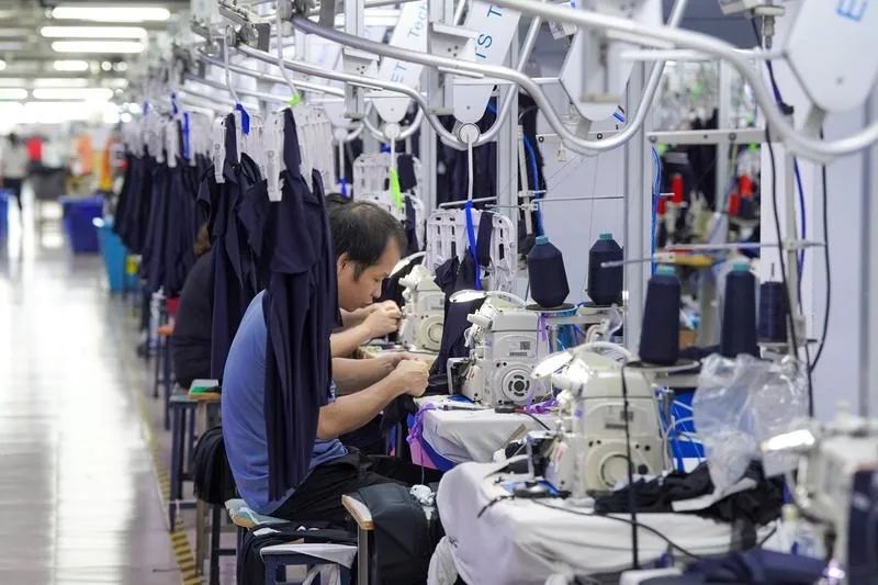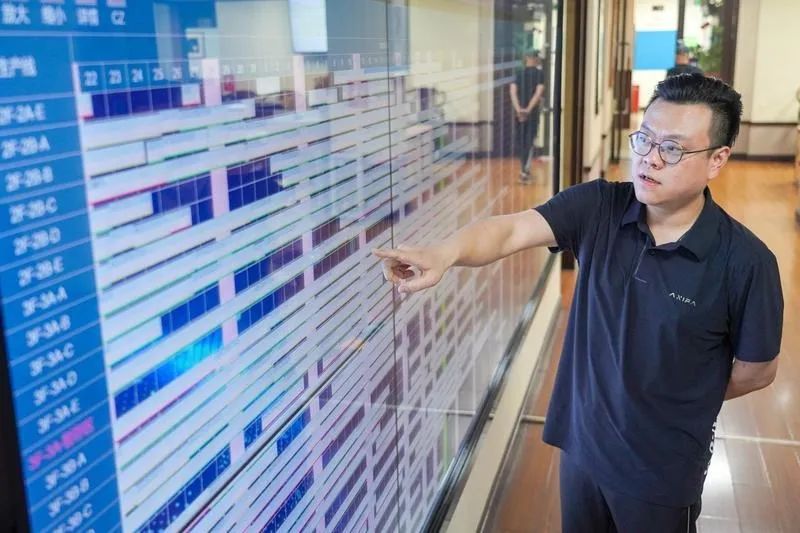 在通伟服装一楼办公室前,一块约10平方米大小的电子显示屏上,正实时显示着当日车缝件数、入库合格率、残退率等各项生产数据。通伟总裁刘学聪一边介绍一边用手指轻点屏幕中的一项订单,含有样图、布料清单、辅料清单等信息的详情页立刻跳转出来。据公开资料,这仅是ERP系统的小小展示,凭借这个企业自主研发的管理系统,通伟率先在业内实现了信息化、数字化发展,并以此形成强有力的核心竞争力。(中山市通伟服装有限公司:裁床、车缝、烫衣、包装制衣数字化智能化车间)2022年,通伟获评中山市数字化智能化示范车间,年产值达3.6亿元,稳居沙溪镇服装制造企业龙头地位。 金蝎服饰:数智化转型升级,产能提升15%