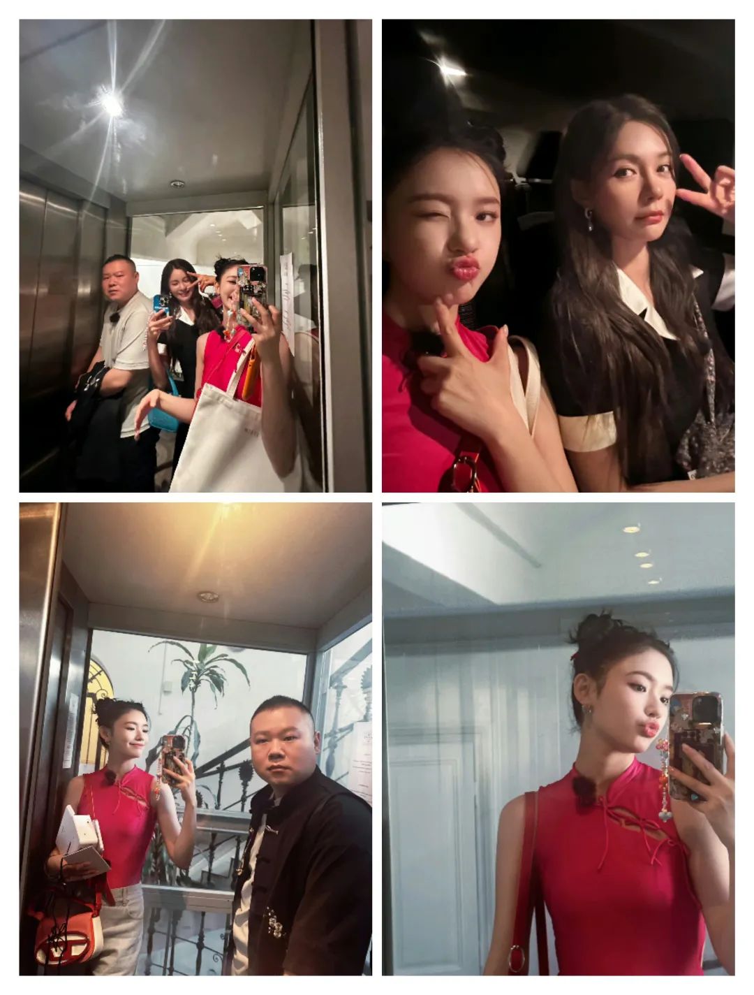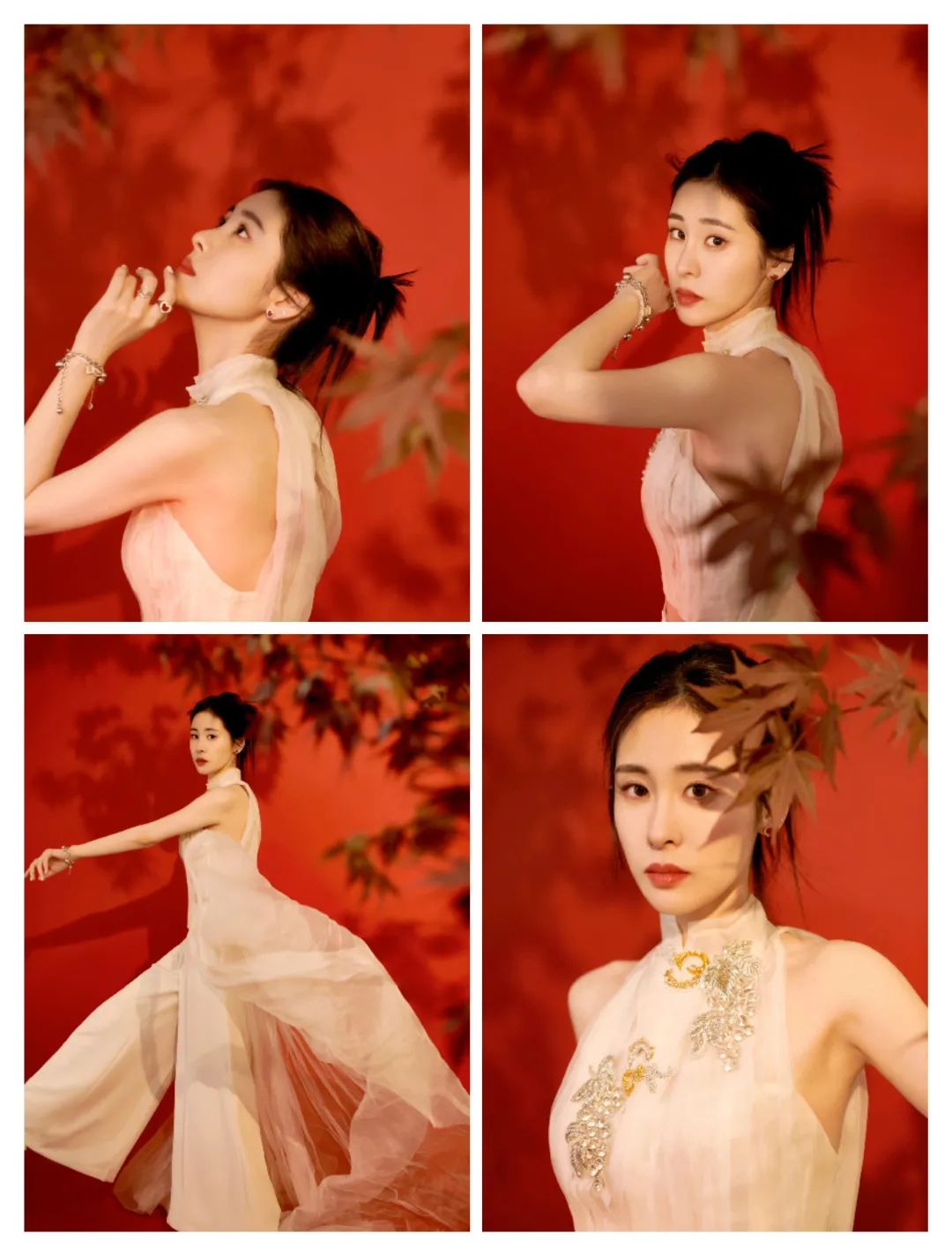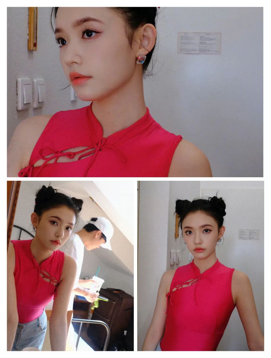 林允的服装以旗袍元素的上衣为主,无袖的上衣在鲜艳的洋红色上,多了色彩的鲜艳和显白的时尚感。