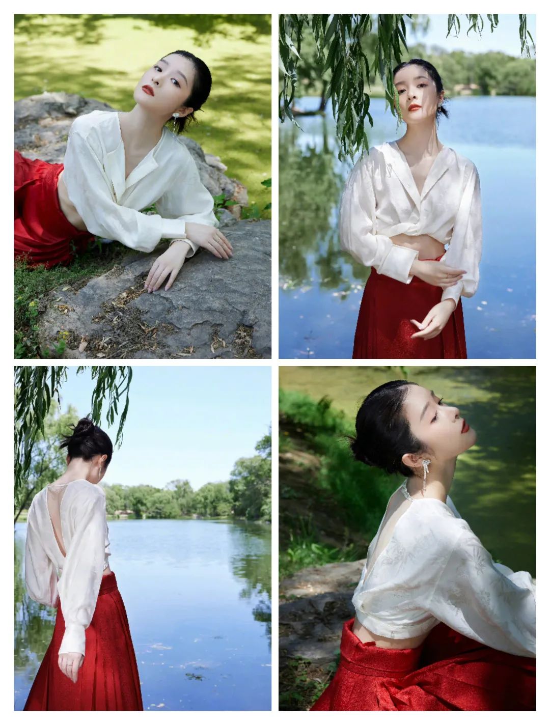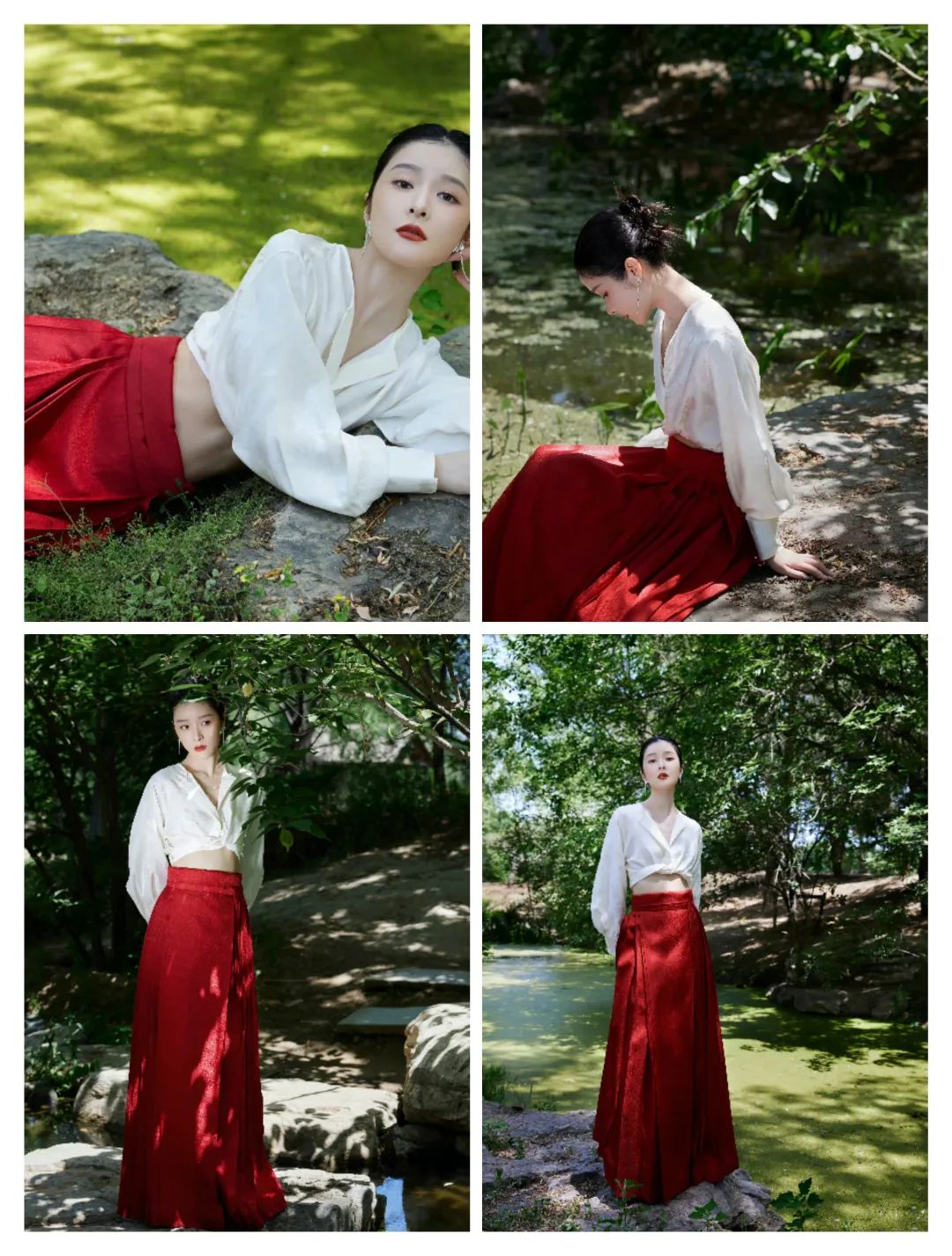 这套穿搭以白色和红色裙装的搭配,白色和红色之间的撞色对比,更是丰富了气质;