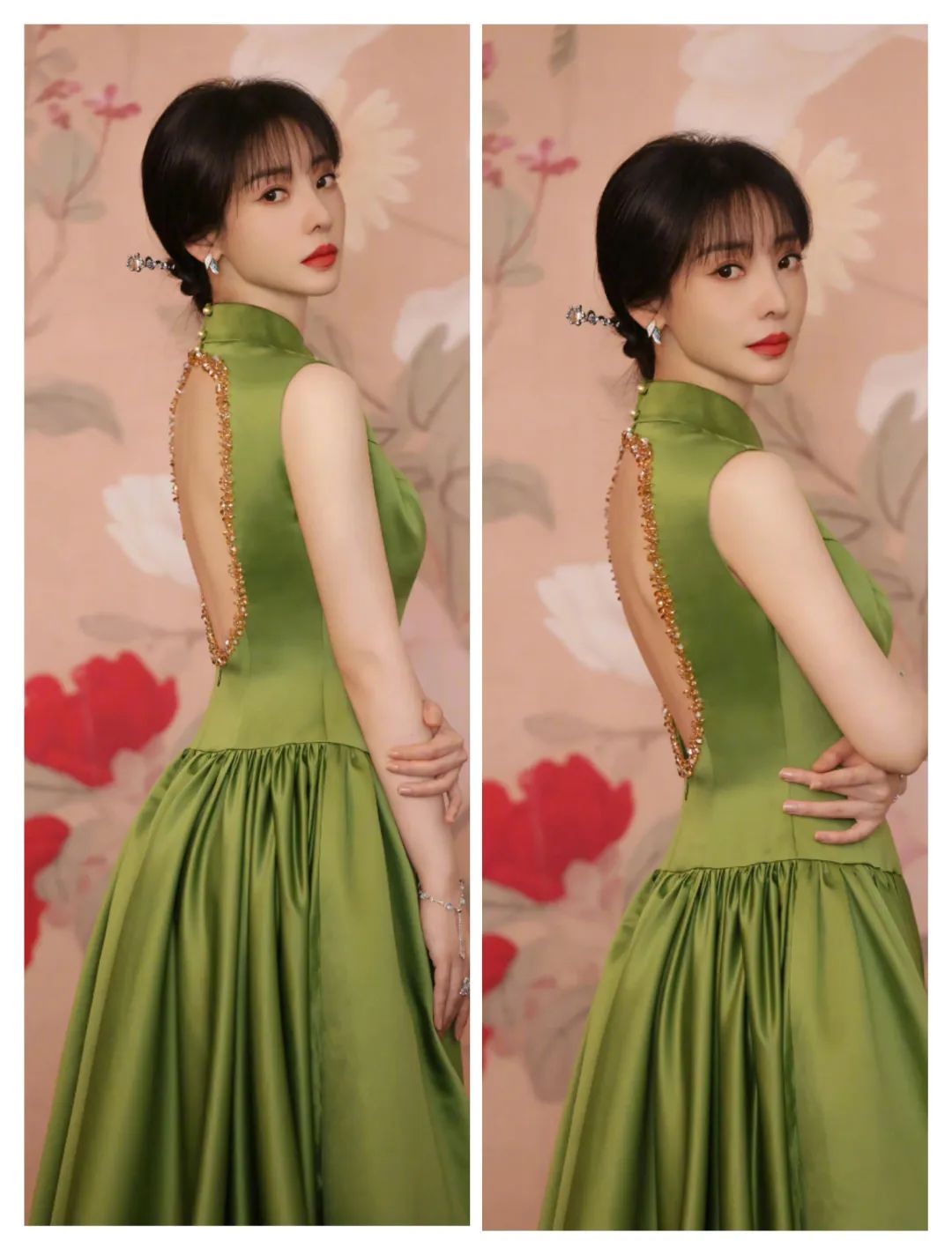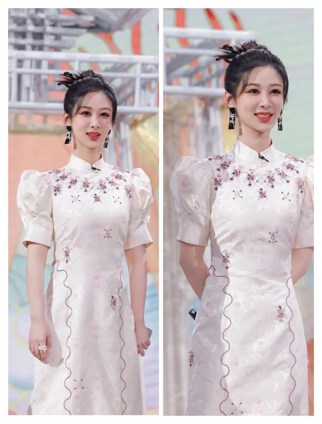 杨紫的旗袍有一些色彩的撞色冲击带来的花纹图案的活力,也在泡泡袖的造型中,多了一些蓬松和甜美的时尚;
