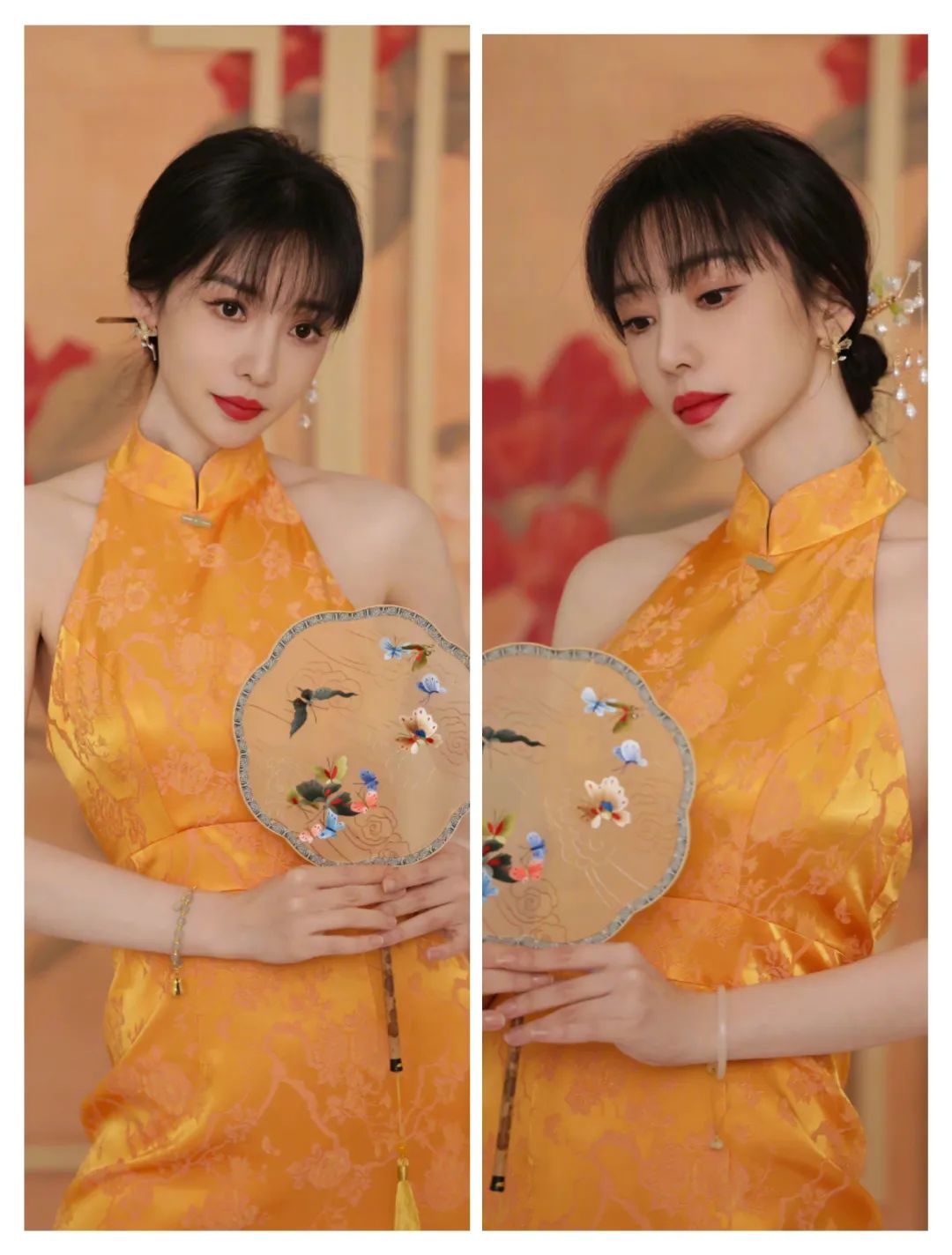 柳岩的旗袍在橙色的温暖中,还有不同色彩的爱搭配,多了一些暗纹的低调,而插肩式的露肩设计,更是时尚感;
