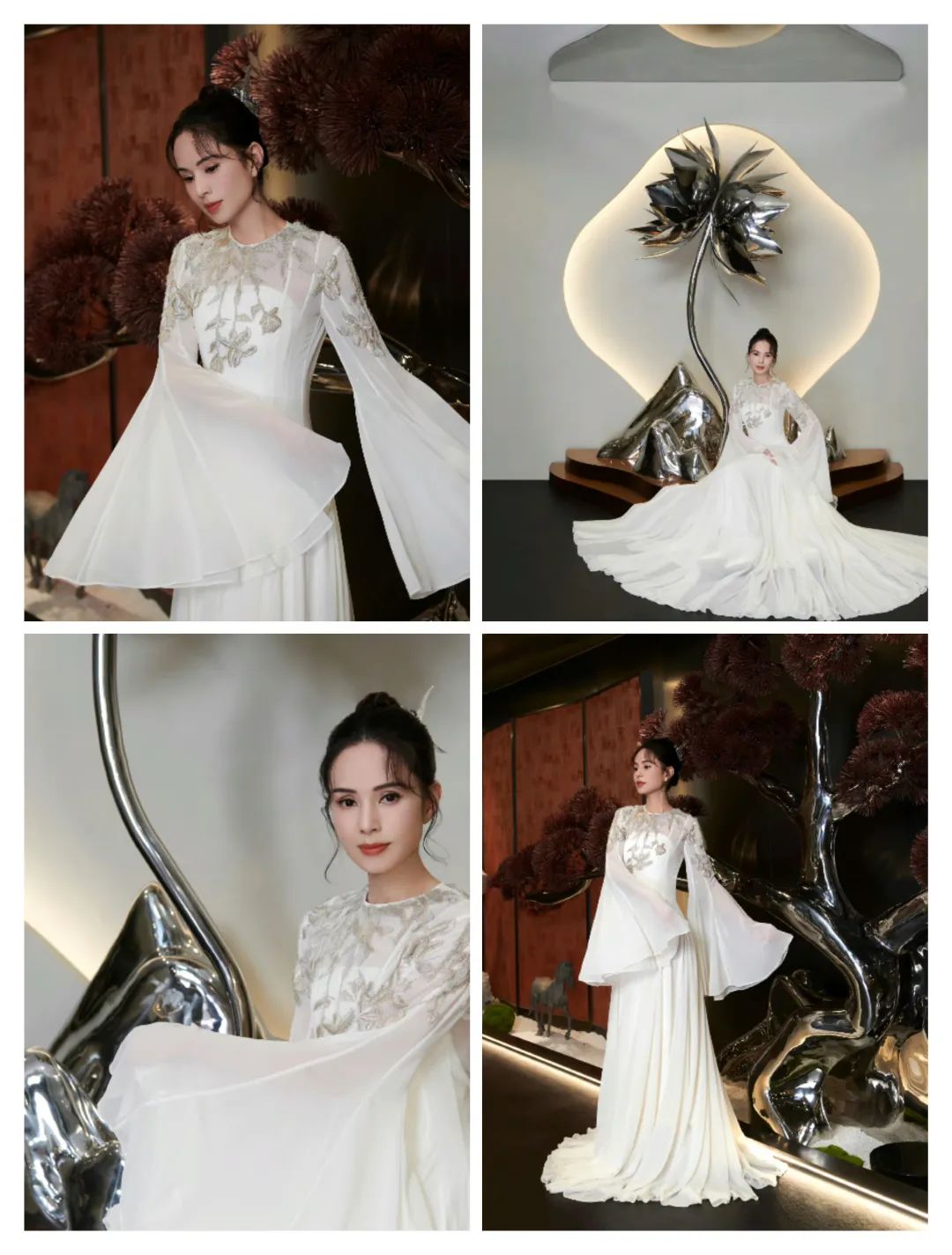 白色颜色为主的连衣裙穿搭中,更有一些轻薄面料的轻盈感,在宽大的喇叭袖造型上,带来了一些造型感。