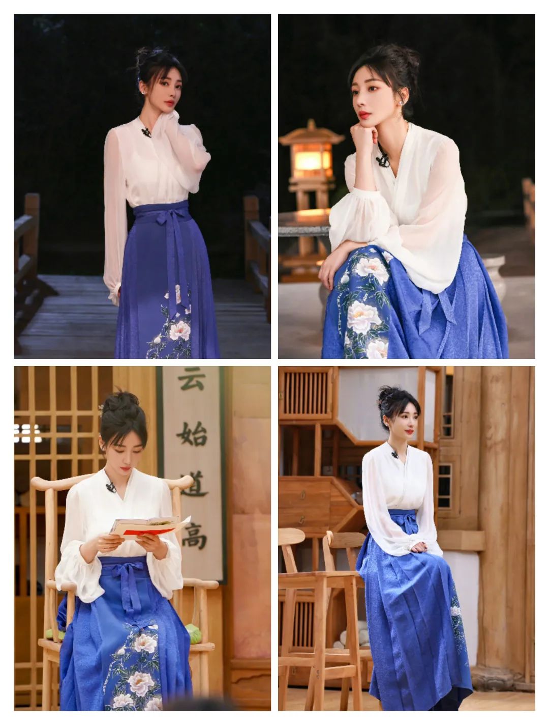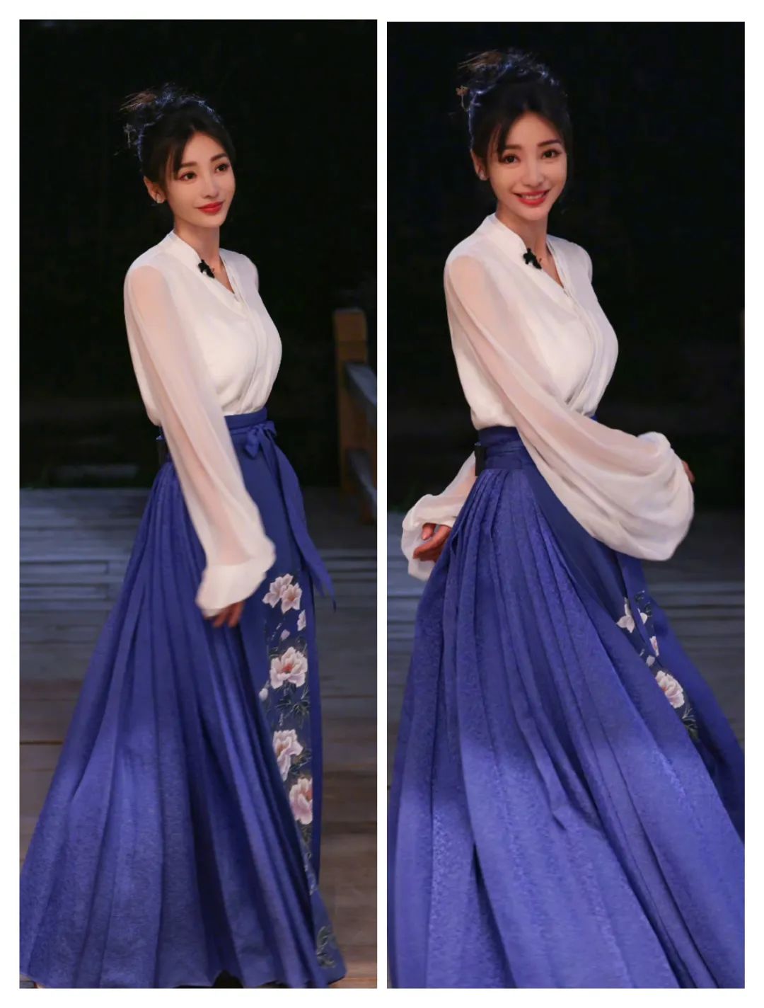 和蓝色马面裙搭配在一起的时候,这款马面裙的图案集中在了前片位置,也有更多视线集中在此;