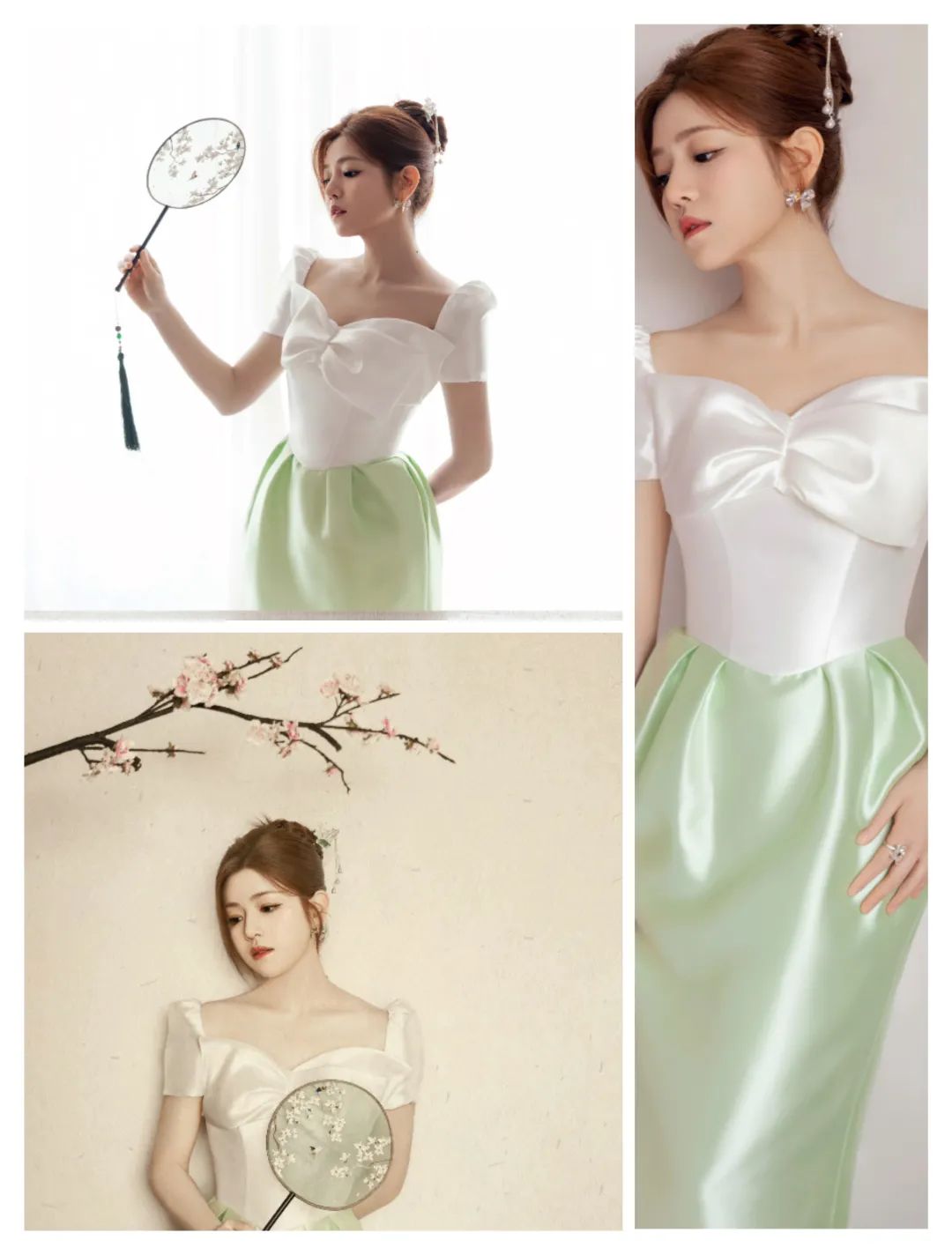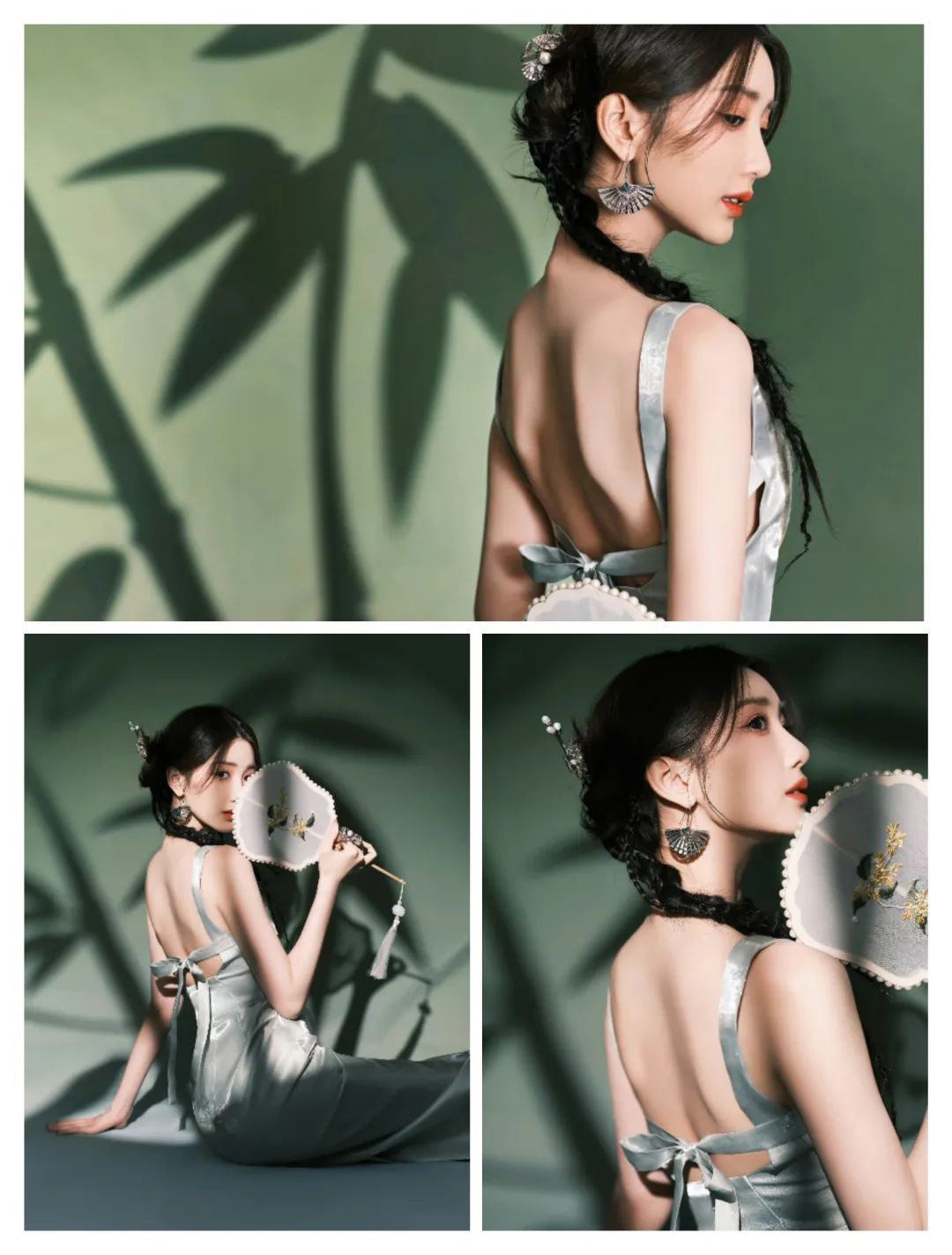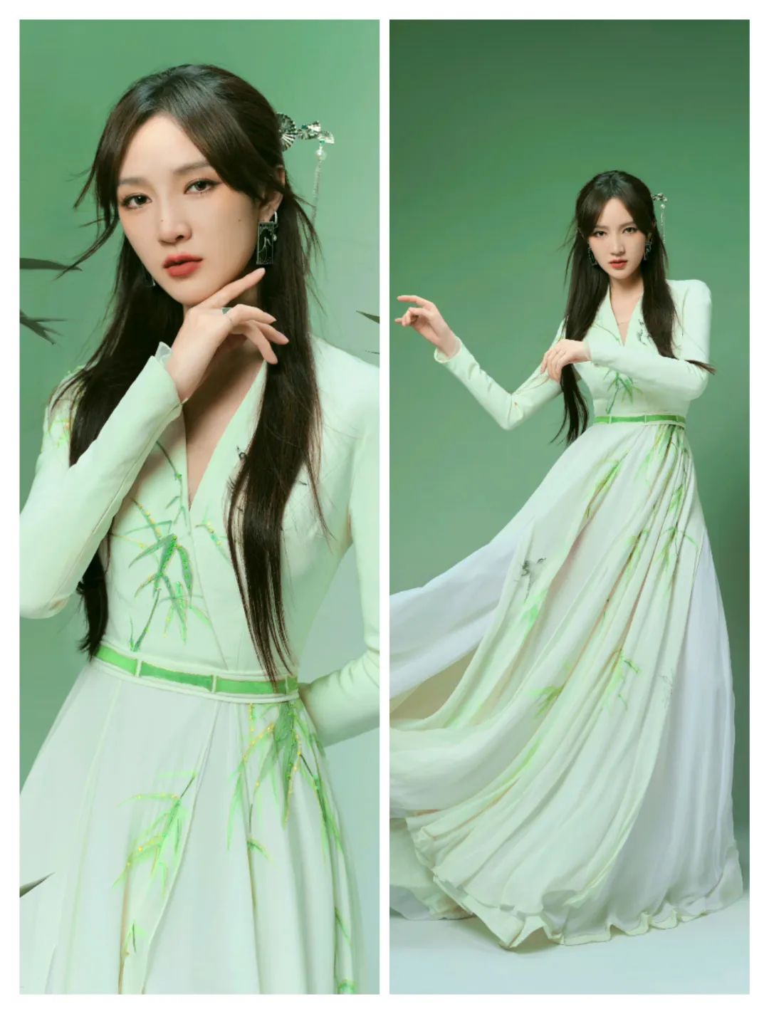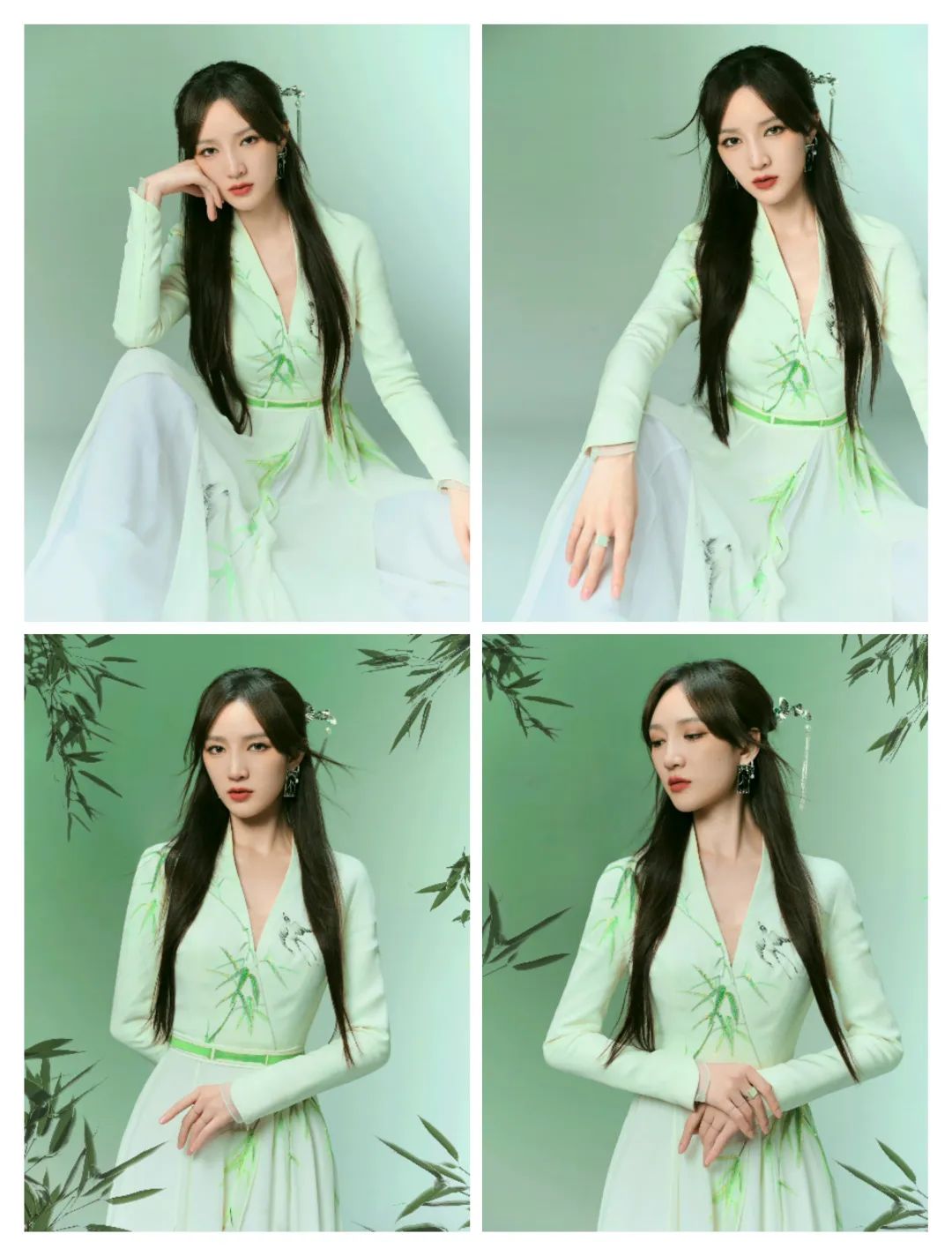 绿色的裙装还有一些竹叶图案的装饰,更多清新素雅。