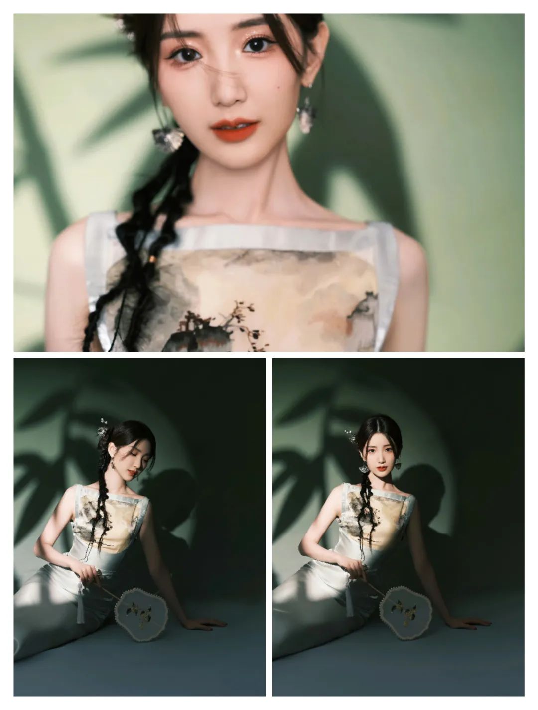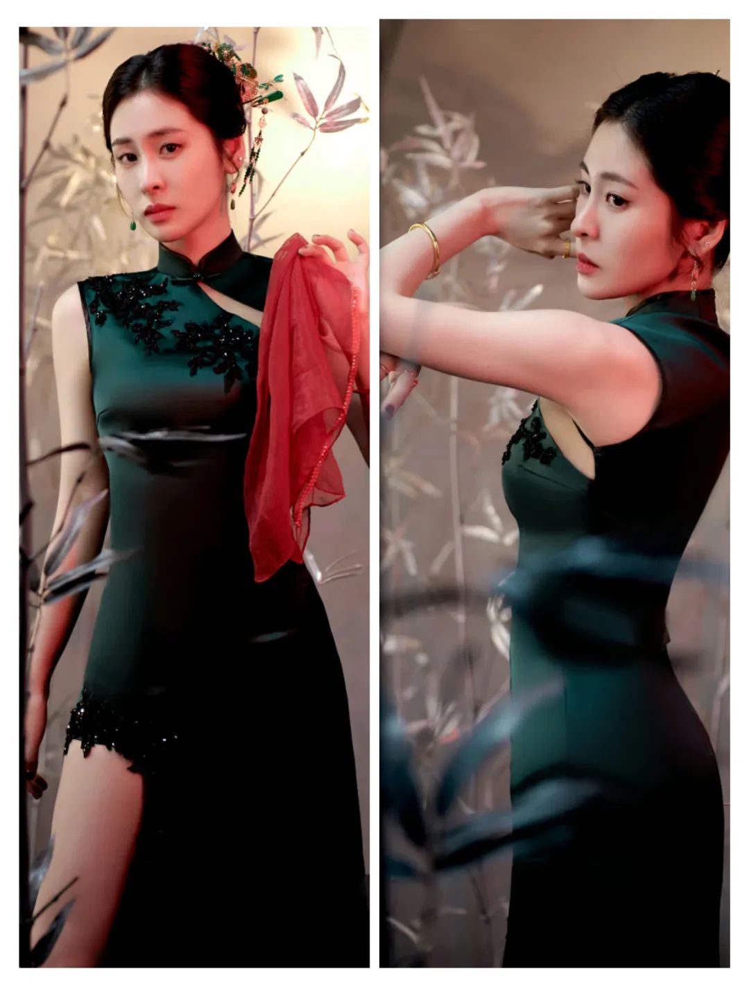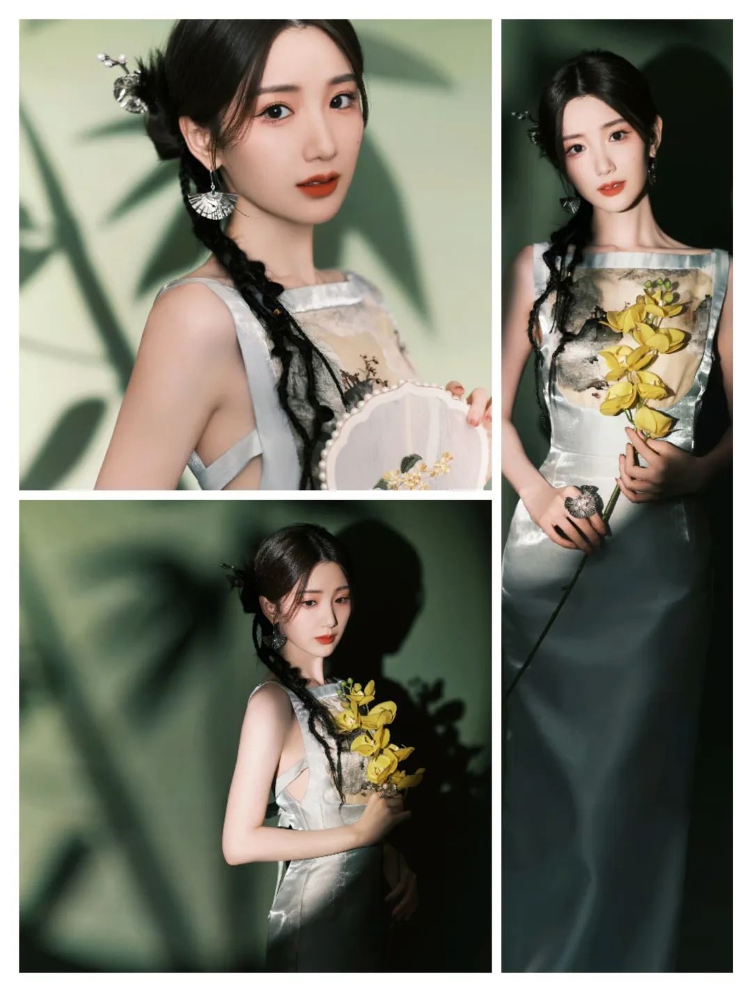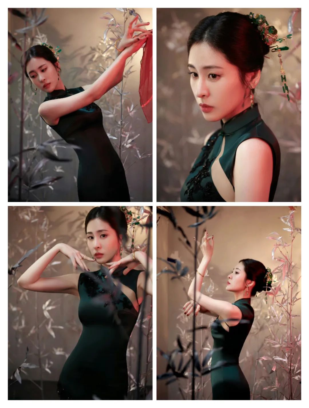 绿色的裙装还有一些竹叶图案的装饰,更多清新素雅。