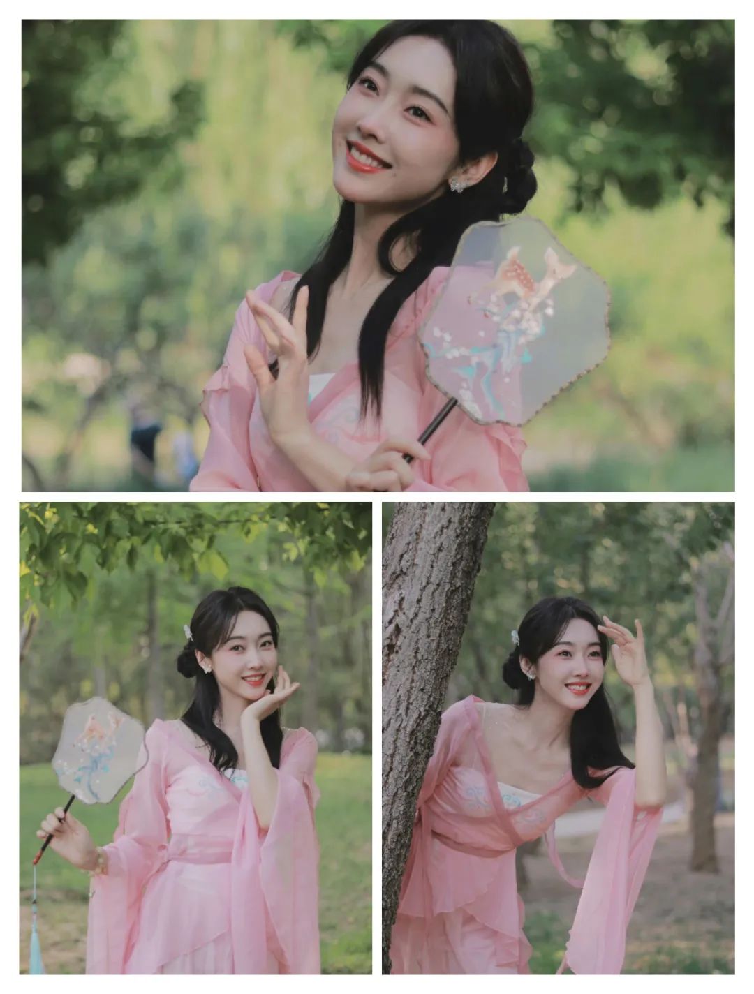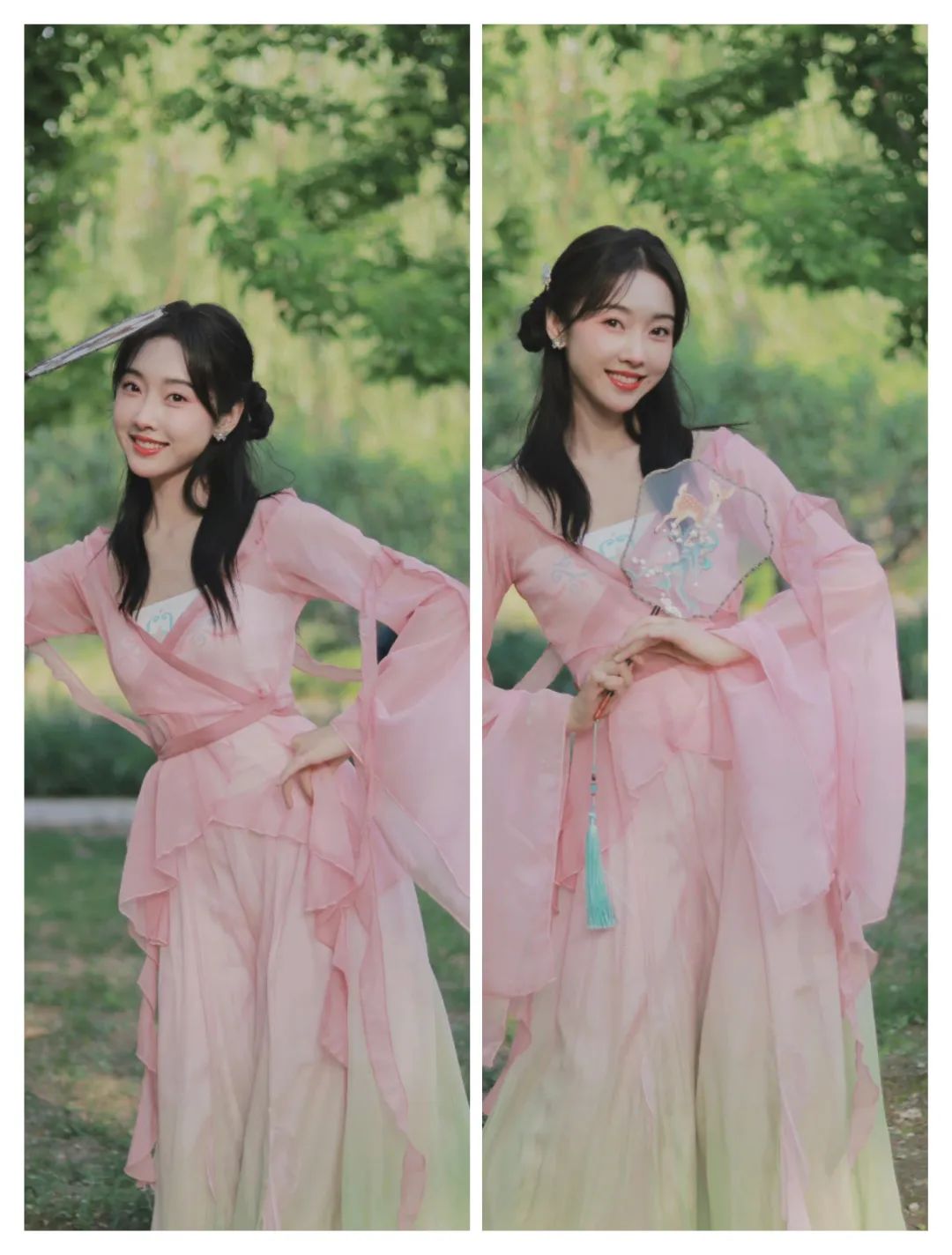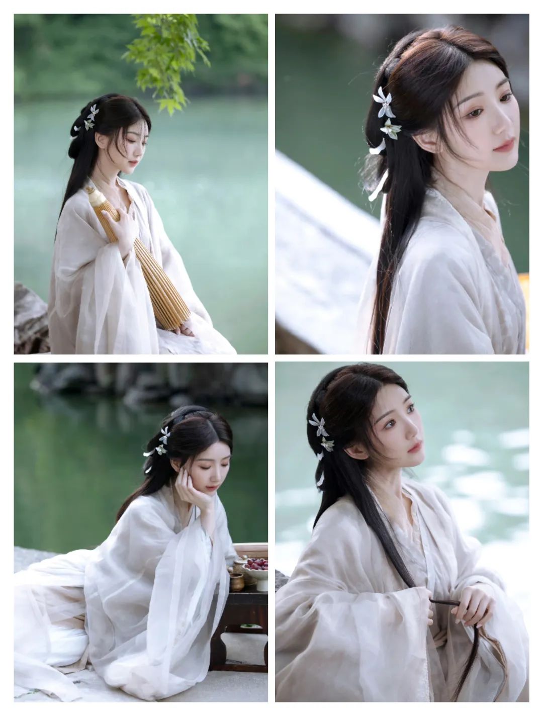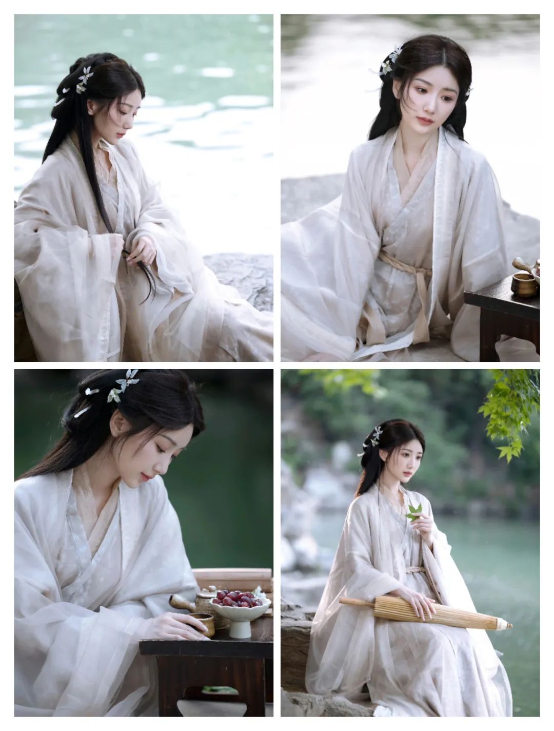 浅色颜色为主的汉服穿搭中,不仅有东方的韵味也有不少柔和的时尚;