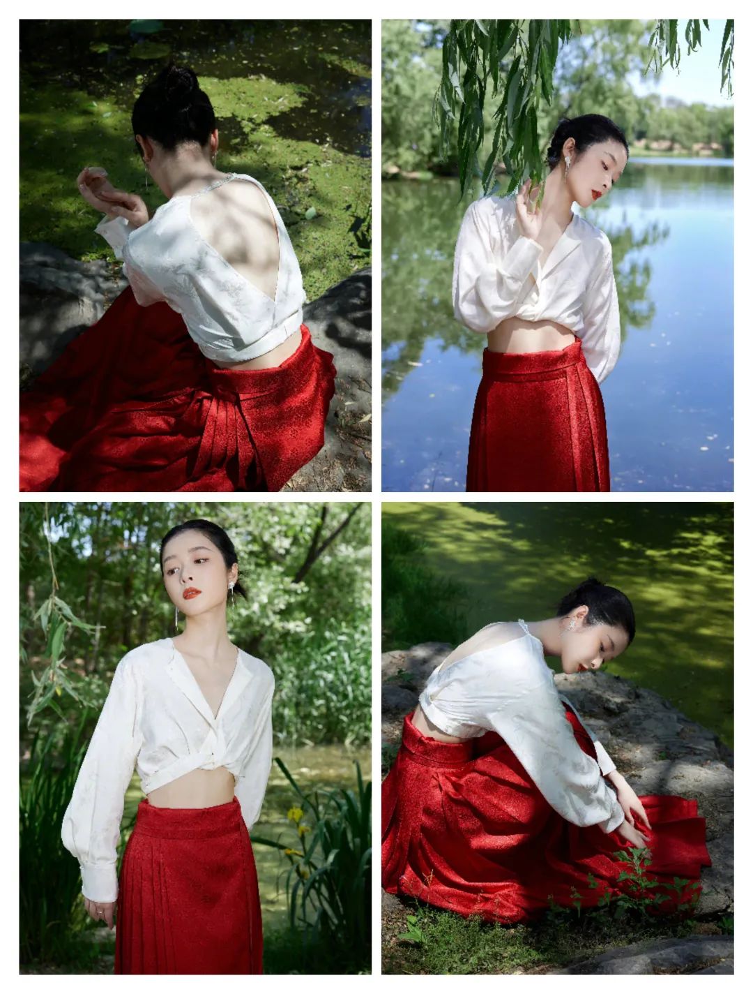 白色的短款上衣在搭配中,选择了红色的马面裙,增加一些红色的鲜艳热情。