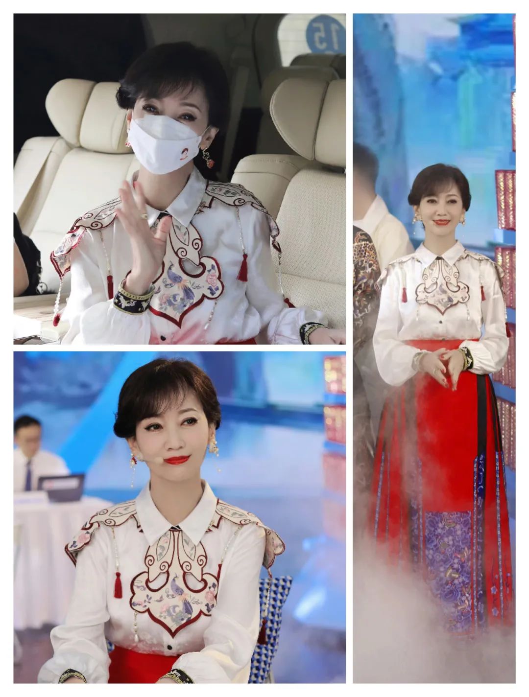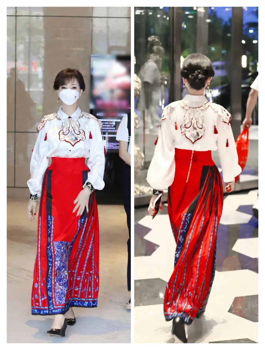 白色衬衫和云肩结合的上衣,和这些花纹的红色马面裙搭配,带来了更多的气质。